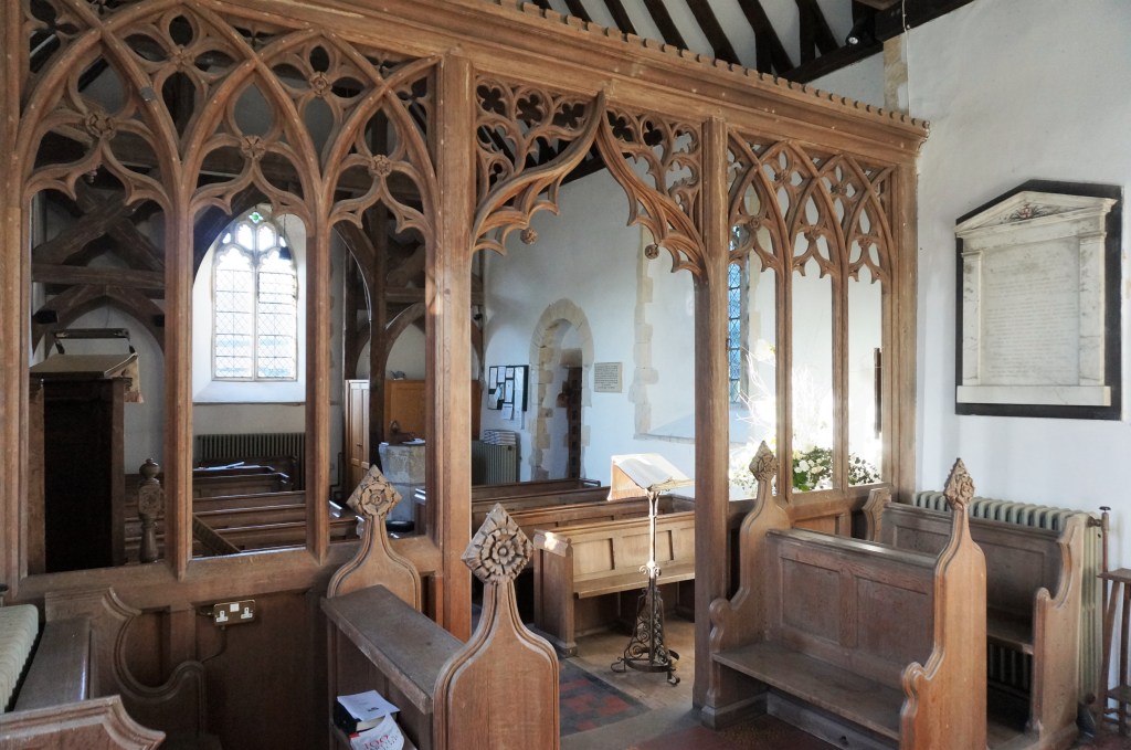 The other is St Dunstan’s in Frinsted, an estate village high up on the Kent Downs south of Sittingbourne. Here, Scott Junior sumptuously embellished the eastern half of an originally medieval church that had already been enlarged by R.C. Hussey in 1856-1861. The work was carried out in two phases, the first in 1867 for Lord Kingsdown, and the second in 1877 for his brother, Edward Leigh-Pemberton. The church was refurnished throughout and a sumptuously tiled floor introduced in the chancel and sanctuary. The walls and roof of the chancel and Kingsdown Chapel to the north were lavishly adorned with painted decoration and a huge chancel screen installed, reaching from floor to ceiling in a mass of intricately jagged cusping.