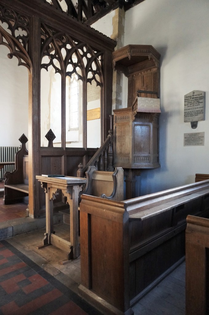 In 1870-1872, a restoration was carried out on the medieval church of All Saints in Chillenden, a tiny village in a picturesque fold of rolling countryside about half way between Canterbury and Deal. Petrie’s watercolour of 1807 showing the building as it was before depicts a tiny, two-cell structure with a funny little offset bell turret. It remained a modestly-scaled building after the restoration, but hugely enriched. It was reseated throughout and gained a new floor in the chancel and sanctuary with delicately patterned encaustic tiles. The Jacobean pulpit – which, unusually, retains its sounding board – was set up on a new base with new stairs, all detailed with sympathy for such a piece that was rare at the time, even if it did slightly accentuate its already gangly proportions. Externally, the old bellcote was removed to make way for a larger, centrally-positioned replacement, covered in shingles and with an elegant spire to give the church a bit more presence in the landscape. The porch shown in Petrie’s watercolour was replaced with a new structure whose bargeboards are handsomely cusped.