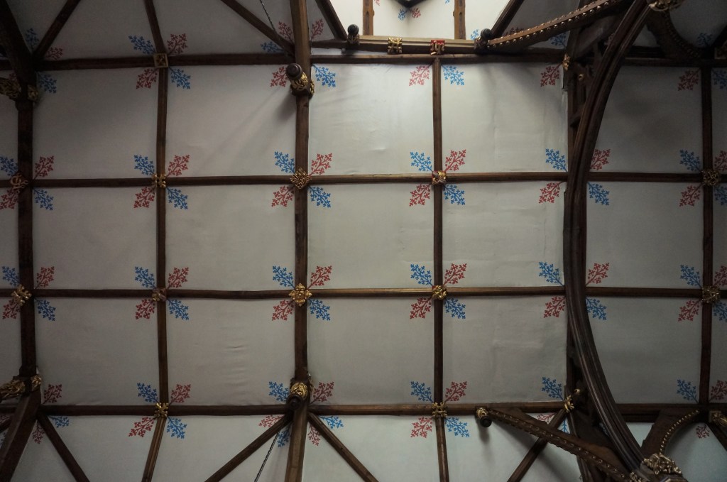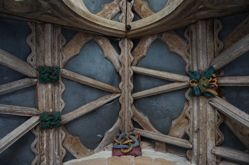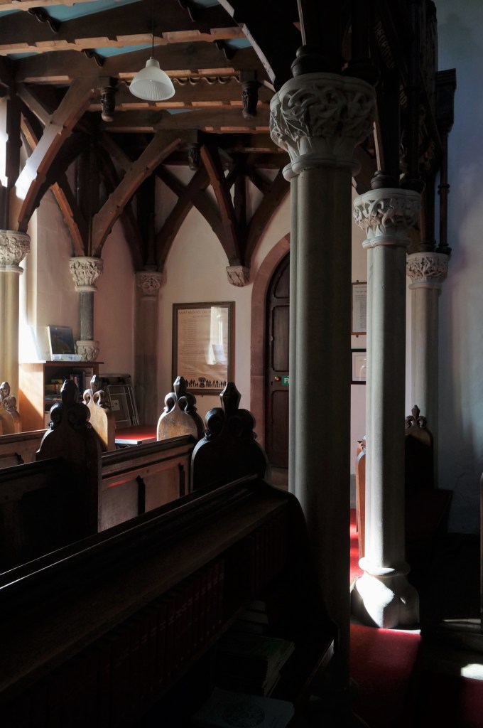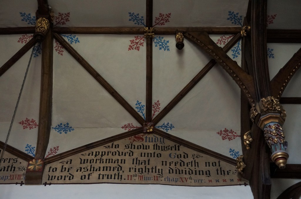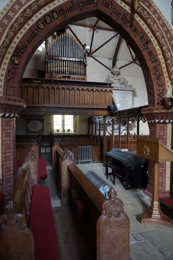 The retention of the medieval fabric of much of the body of the church provided less opportunity for such bold experiments in form, but Parker’s distinctive aesthetic nonetheless dominates through the imposing and distinctive roof, the tour de force of the west gallery and the vibrant scheme of painted decoration (whitewashed around 1900 and not uncovered and restored until 1958-1960). The nave and chancel are not structurally differentiated, and so Parker marked the division by inserting a large openwork timber arch, supported on hammerbeams and running down to enormous carved and gilt pendants. These may have been inspired by the late 15th/early 16th century nave roof at St Davids Cathedral. Certainly the benches with poppyheads were Parker’s work and the configuration of the interior was, as left by him, apparently that of a Georgian auditory church, with the seating arranged in the manner of a collegiate chapel and focused on a double-decker pulpit on the south side of the nave rather than the altar. This was reordered in 1937-1945 to provide a more conventional arrangement, although Parker’s benches were retained.