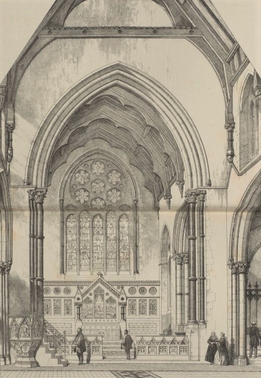 Design for the Anglican church of the Resurrection in Brussels (1862), interior looking towards sanctuary – as reproduced in Examples of modern architecture ecclesiastical and domestic of 1870