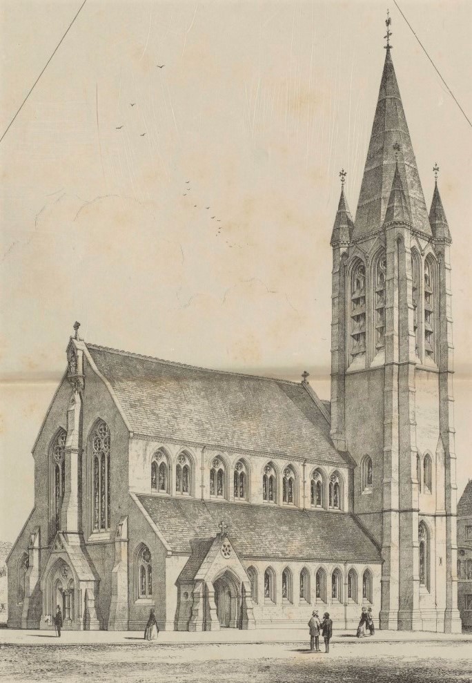 Design for the Anglican church of the Resurrection in Brussels (1862), exterior view – as reproduced in Examples of modern architecture ecclesiastical and domestic of 1870