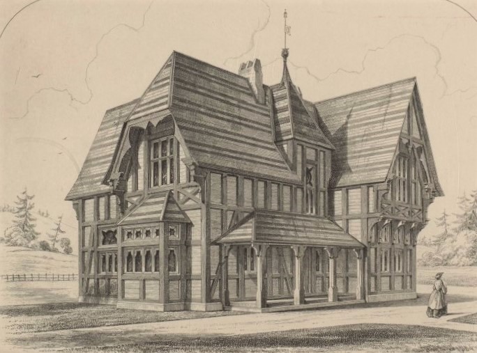Design for the parsonage in the Newcastle neighbourhood of the town of Miramichi, British Columbia, Canada, as reproduced in Examples of modern architecture ecclesiastical and domestic of 1870.