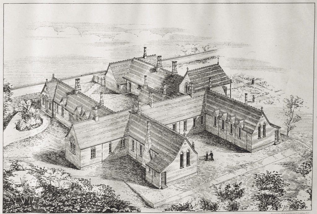 St. Mary’s College, Harlow, Essex: bird’s-eye view and scale plan based on a view that originally appeared in The Builder in 1862. As far as can be ascertained, the cloister and chapel were never built. (Wellcome Collection, Attribution 4.0 International (CC BY 4.0))