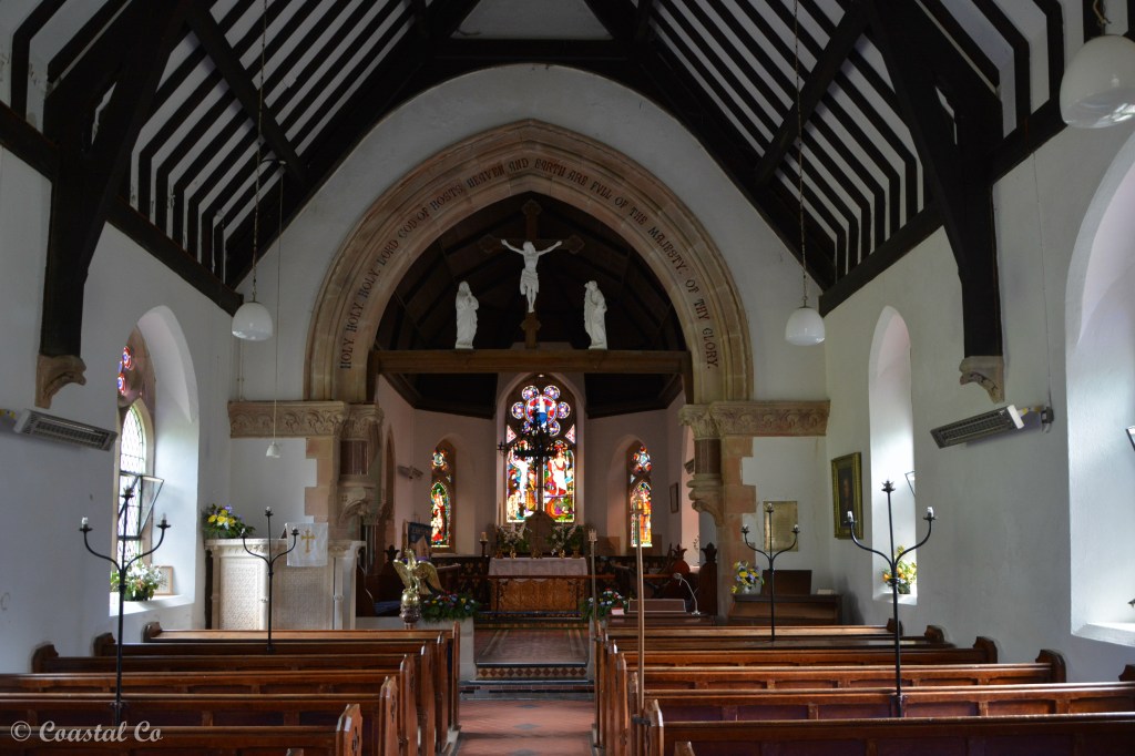 But the interior has more punch than Llanbedr Dyffryn Clwyd, with much superb quality carving – foliate ornament to the capitals and imposts of the chancel arch, diaper work to the panels of the pulpit. There are the polished granite column shafts so beloved of High Victorian Goths and much vividly patterned tilework on the floor of the chancel, rising in the sanctuary to dado height. The fenestration of the apse is resolved much more successfully by making the central window wider than its neighbours. All the windows in the chancel are glazed with excellent quality stained glass by Robert Turnill Bayne (1837–1915) of Heaton, Butler and Bayne. This was installed at the time of construction, as was the glass in the west window by Clayton and Bell. A complete set of original fittings survives and the whole adds up to a confident, strident and colourful period piece that is remarkable for its aesthetic integrity and excellent state of preservation.