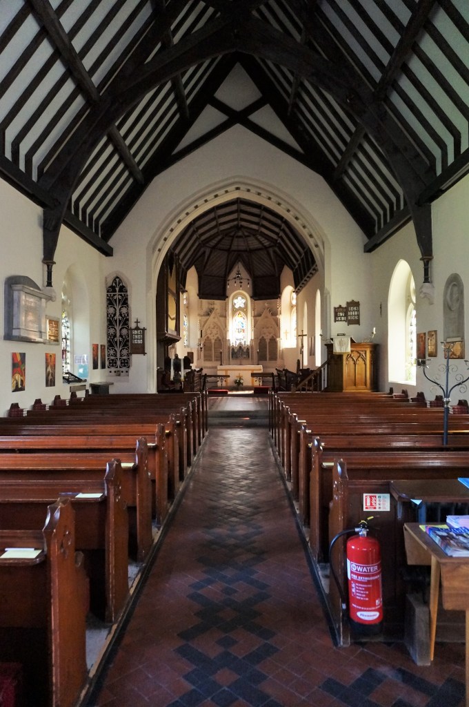 The interior is a little tamer. As usual, the focus is on the east end with the Decalogue boards, Creed and Lord’s Prayer (here all in Welsh) framed in blind openings of cusped tracery with gablets above, all richly adorned with pinnacles and crockets. The pattern of the fenestration means that the reredos squeezed in between them is comically underscaled. Tiles by Maw & Co and stained glass by Clayton and Bell installed at the time of construction (as recorded by an inscription in the tympanum of the vestry doorway) give colour. There is excellent ironwork filling a sound hole through which the organ speaks into the nave and the bold carpentry of the roof structures gives further visual interest.