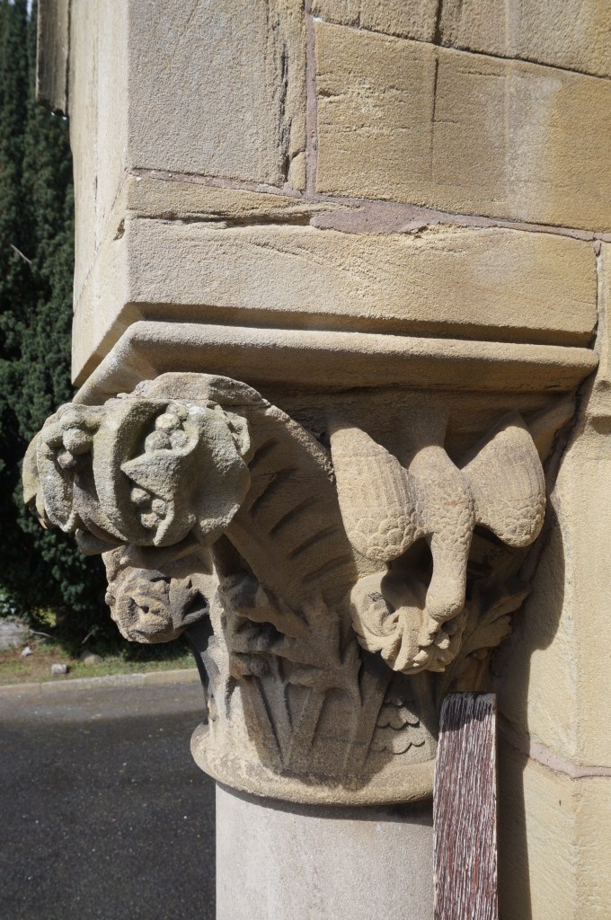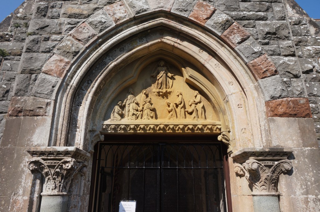 Firstly, in 1866, the church of St Mary was rebuilt on the site of a 17th century predecessor. It is a variation on the theme set by Llanbedr Dyffryn Clwyd – again a two-cell structure with a short chancel terminating in a polygonal apse and an east window breaking through the eaves cornice into a dormer. Again, there is rock facing, striped arch heads, plate tracery and banding to the slate roof. Though the tower is more massive, there is the same love of geometric invention in the handling of its transformation into an octagonal spire, whose upward progression is interrupted by a ring of colonettes supporting trabeated openings – almost as though the top had been sliced off and this stage inserted as an afterthought. The tympanum of the main entrance is occupied by a relief of the Ascension, based on one discovered during investigations of the abbey ruins.