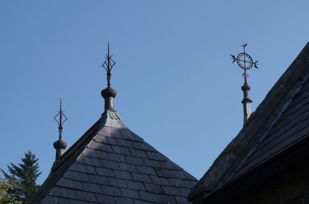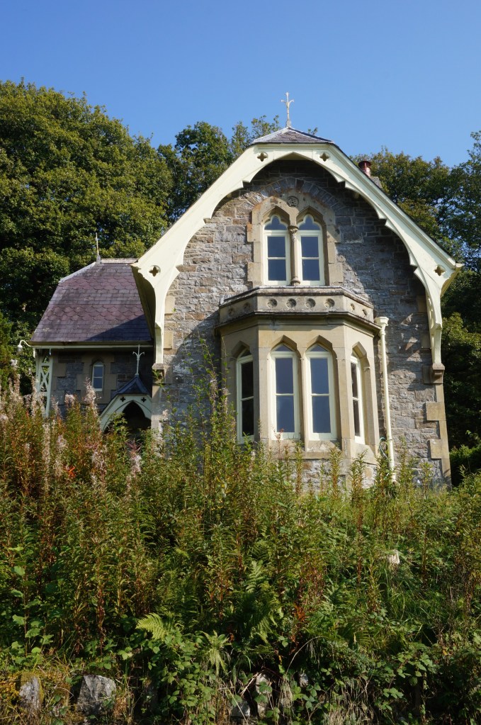 It is a simple, two-cell building of modest proportions – a nave of four bays with an apsidal chancel of two – but the designers exploited every possible opportunity to make it a vehicle for really forceful expression in sculptural form, ornament, colour and texture. The use of rock facing and structural polychromy is already familiar from Ruthin town hall, here augmented by the vividly striped voussoirs and further enhanced by the banding of the slate roof. There is plate tracery throughout, even in single lancets. The windows of the apse break through the eaves into dormers, the upper stages of the towerlet, which starts off as a square and turns hexagonal, goes off on the most extraordinary geometrical excursions. Everything is overscaled and exaggerated to the point where it becomes almost a parody of Gothic, an effect underlined by the huge crockets budding from the steeple, bold ironwork crosses and railing to the ridge of the chancel roof. ‘The funny little thing is so powerful… that I feel its preservation is most important, its unique potency being, in my experience, unmatched in so small a compass’, wrote architect Sir Clough Williams-Ellis (1883-1978) to J.D.K. Lloyd in a letter of 2 May 1977.