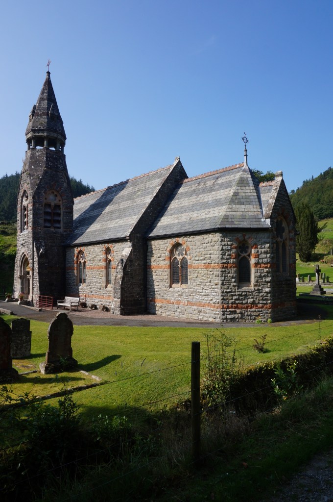 That same year, the firm designed a new church for the village of Carno, located in a river valley northwest of Newtown (formerly in Montgomeryshire, now Powys). The uncompromising stylistic language is by now familiar. Here, the rock facing is varied with dressed red sandstone, which is used for inserts in the spandrels of the plate tracery. The vigorous impression is marred by the loss of the original timber bell turret, which had to be removed in c. 1978 after becoming unsafe and was reinstated in much simplified form. But for all that, it is a highly rational design compared to Llanbedr Dyffryn Clwyd – a single volume with unbroken wall surfaces and roofline externally, and no structural division between the nave and chancel internally, just doubled up roof trusses supported on compound attached colonettes rather than corbels. Again, the carpentry of the roof, here with scissor-braced trusses, is a prominent feature of the interior.