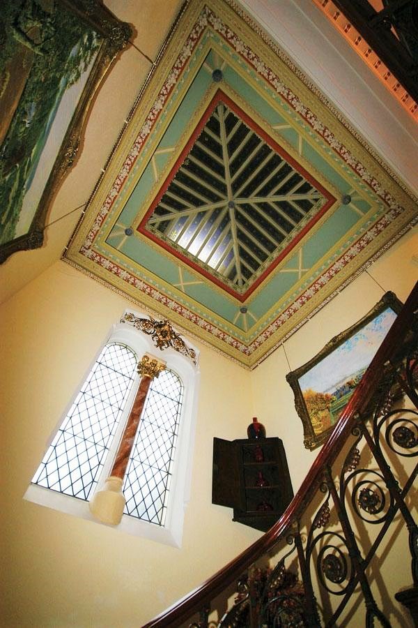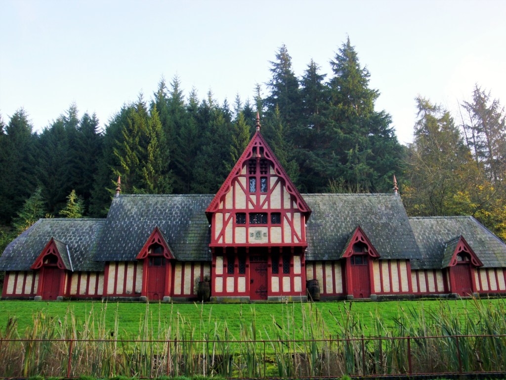 In 1867, work began on remodelling the hall, which lasted until at least 1870. Reputedly it incorporates fabric from its predecessor, but quite how much and to what extent this determined the outcome is impossible to say without further research. There are signature details such as the chunky colonettes with outsize foliate capitals and striped arches and relieving arches, although the walls are all finished in smooth, uniform ashlar rather than rock-faced. The most remarkable feature is the ensemble of three major and three minor gables to the long garden front and J.D.K. Lloyd had good reason to say that ‘This remarkable house gives a first impression of being subsidiary to the bargeboards!’ But for all the ingenious detail, there is a slight sense that the architects’ imagination flagged when dealing with a building on so large a scale, which offered less opportunity for treatment as a discrete sculptural form. This can be checked through comparison with the delightful Keeper’s Lodge a couple of miles down the valley to the east, which must be roughly contemporary with the Hall.