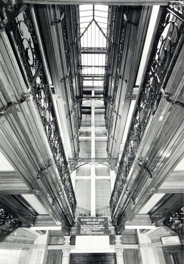 The treatment of the exterior did not exploit the opportunities for non-load-bearing construction in the same way as Knightley’s smaller commercial properties in the City of London. But the interior was another matter. The main entrance led into a top-lit stairwell with twin staircases on either side of a central atrium running the full height of the building, which seems to have been based on a skeleton construction (i.e. a structure based on a load-bearing steel framework as opposed to using steel just for horizontal spans between masonry-built walls). The staircases were richly ornamented, with carved oak newels and rails, and cast-iron balustrades. At the opposite end to the entrance, the steel structure of the central banking hall was exposed to view. As explained in Jonathan Clarke’s Early Structural Steel in London Buildings, the dome was framed with 16 mild-steel ribs. ‘Each rib was seated on a cast-iron stanchion embedded in the thick brick wall forming a 30ft-high [9.1m-high] drum, the outward thrust contained by a steel ring connecting the tops of the stanchions. The upper ends of the ribs were bolted to a steel compression ring, 15ft [4.6m] in diameter, which formed the base of a circular iron and glass lantern. Lightweight hollow ceramic blocks and timber rafters, covered with boarding, felt and lead, spanned between each rib, forming the dome’s 16 panels, each of which was pierced by an oval window’. The steel construction allowed for the incorporation of a 10ft/3m-wide gallery which, cantilevered out from the stanchions, extended for the whole of its perimeter at first-floor level.