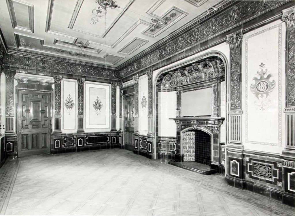 Though the exterior of the bank looked out onto narrow thoroughfares, it was treated with splendour meriting a far more prominent location. Stylistically, it was a sort of free, lushly ornamented Mannerism, the basic idea of the elevations being a two-storey plinth supporting a coupled giant order embracing the upper two storeys. At the southwestern corner was a tall entrance tower set at 45 degrees to the main axes, which rose to a pyramidal spire. This had a practical as well as decorative function, since the topmost stage housed a tank fed by water from the Bank’s own artesian well sunk below the site. The outstanding feature of the exterior was the cladding of matt-glazed stoneware, an innovation of Doulton’s of Lambeth dating from 1888, which was marketed under the name Carrara ware. From a practical point of view, its principal appeal was its resistance to atmospheric pollution, an important consideration at the time.