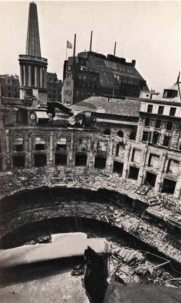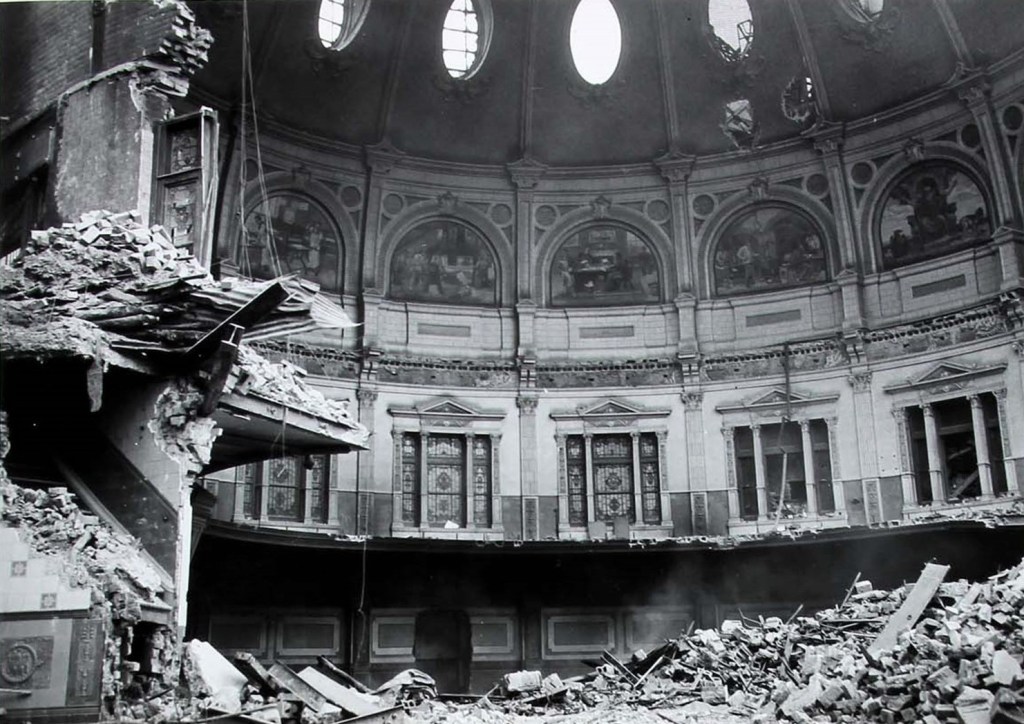 The hall suffered blast damage on two occasions during World War II, then, during one of the most destructive raids of the Blitz, was completely gutted by incendiary bombs on the night of 10th-11th May 1941. After the war, there was considerable public pressure for the hall to be rebuilt, but in 1946 the Commissioners of Crown Lands increased the ground rent almost ten-fold and efforts were redirected towards the construction of the Royal Festival Hall. In 1954 the government set up a committee to examine the practicability of reconstruction, which concluded that, despite public support for the initiative, a rebuilt Queen’s Hall would be unable to hold its own commercially and so the proposal was finally abandoned. The ruined shell was cleared and the site is now occupied by the St George’s Hotel.