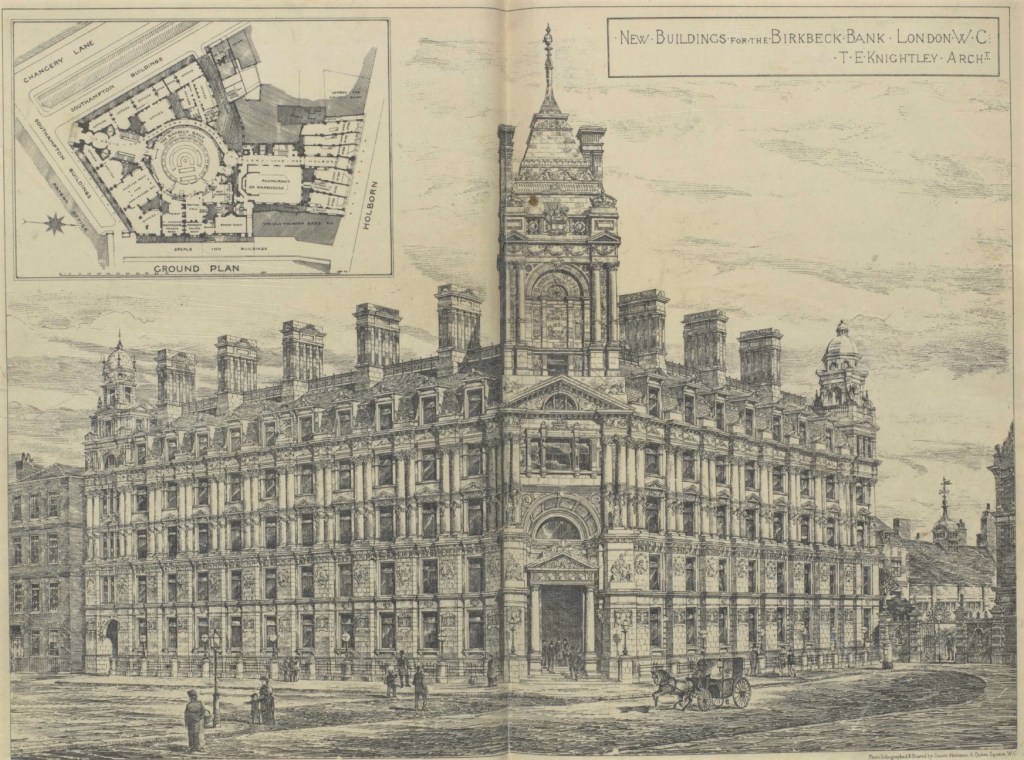 Ravenscroft’s building society proved to be a successful, highly lucrative venture, which grew rapidly. The same was not true of the Birkbeck Institute, however, and following a financial crisis in 1877, Ravenscroft arranged for the building society, now trading as the Birkbeck Bank, to purchase the Institute’s premises on High Holborn. He launched an appeal for funds to construct new premises for it, which raised nearly £4,000; Ravenscroft personally guaranteed the balance of the total cost. Work began on the new building in 1883 and the Institute took up residence there in 1885. Ravenscroft then looked to redevelop the Institute’s former home at Southampton Buildings to provide new accommodation for the bank which suitably reflected its ambition, ethos and prosperity, and also to add to his investment portfolio. The location alone, outside the boundary of the Old Square Mile and so well away from old-established banking houses, was a strong statement of its democratic aims. Knightley was engaged and his perspective of the design attracted favourable comment when it was exhibited at the Paris Salon in 1889.