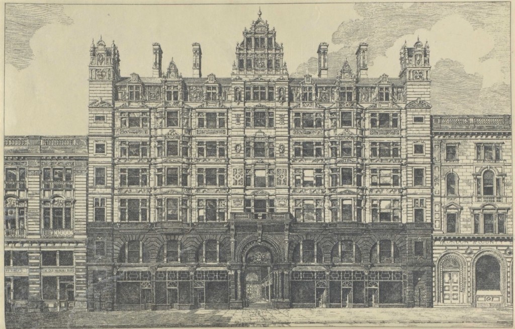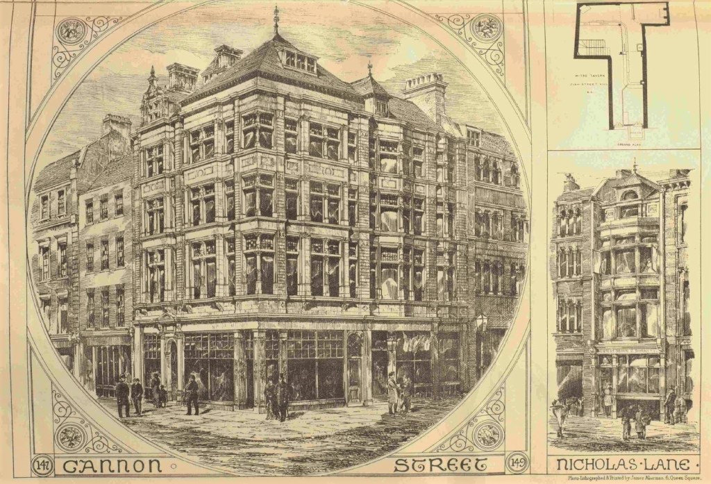 The sole source for the next six buildings is a feature that appeared in The Building News of 19th September 1884 entitled ‘Street Architecture in the City’. It consisted of a double-page spread of lithographed illustrations depicting commercial premises – generally office buildings with shops on the ground floor – all of them located in the City of London near Knightley’s offices on Cannon Street. Frustratingly, the commentary that accompanies the feature, which gives the impression almost of being an advertisement for Knightley’s practice, is extremely brief and provides no background information about the circumstances of any of the commissions. All the buildings pictured in it have been lost and seem to have left only scant traces in the archives.