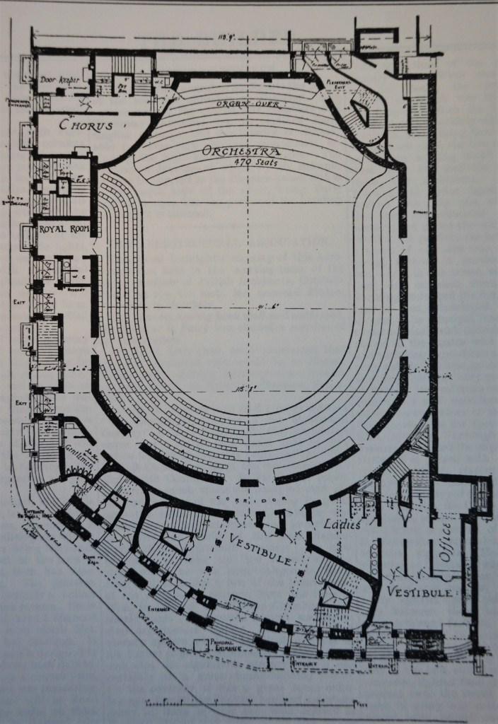 Initially, two promoters were involved in the project, each employing its own architect, and Knightley worked jointly with theatre architect Charles John Phipps (1835-1897), who among other things had remodelled Bassett Keeling’s Strand Music Hall as the Gaiety Theatre. Phipps devised the ground plan and Knightley was to handle the elevations. The second promoter later dropped out of the project, forcing the withdrawal of Phipps, who then accused Knightley of having appropriated his contribution. The matter was referred for adjudication to John Macvicar Anderson (1835-1915), then-President of the RIBA, who ruled that Phipps was indeed responsible for the plan, and for this reason the design is sometimes credited jointly to the two architects. The scheme was published in The Builder of 14th February 1891 (pp. 128-129), with a detailed commentary written by Knightley himself.