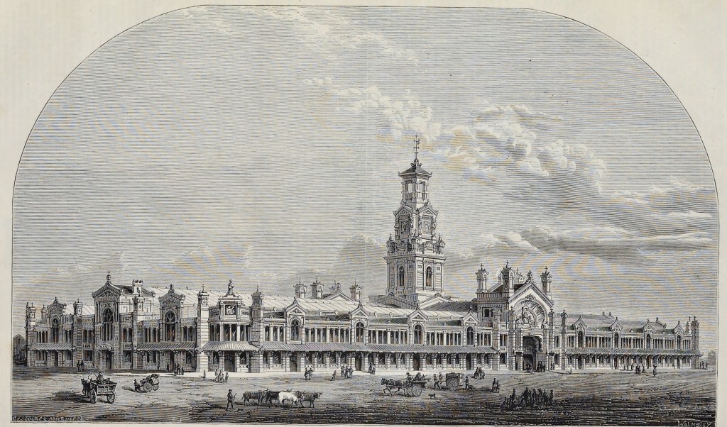 ‘The site is 640 ft. long by 240 ft. broad [195m x 73.2m], and upon it 200 shops of various sizes were required. Each shop has on the ground-floor a small office, and a staircase leading to an upper office, with lavatory &c. This upper compartment takes up one-half of the area, consequently one-half of each shop has a height of 28 ft [8.5m]. The roofs are either flat or simple V roofs; the avenues between the shops have iron roofs covered with slates, glass louvres to the sides, and spring-blinds to run horizontally to keep out the heat. The outer walls, it was proposed, should be built of Portland stone, the penthouse roofs [i.e. the canopies running above the shopfronts] to be covered with lead and supported on iron brackets, the timber arranged in deeply moulded panels. Penthouse roofs were suggested in preference to a colonnade, which would obstruct the public way. The large archway shown in the long side of the design, relieved with sculpture, spans the public roadway that crosses the market site. The central tower, in its lower stages, contains a refreshment-room; above, a clock; and again, above that, a bell. The architects guaranteed the carrying out of their design for £100,000’.