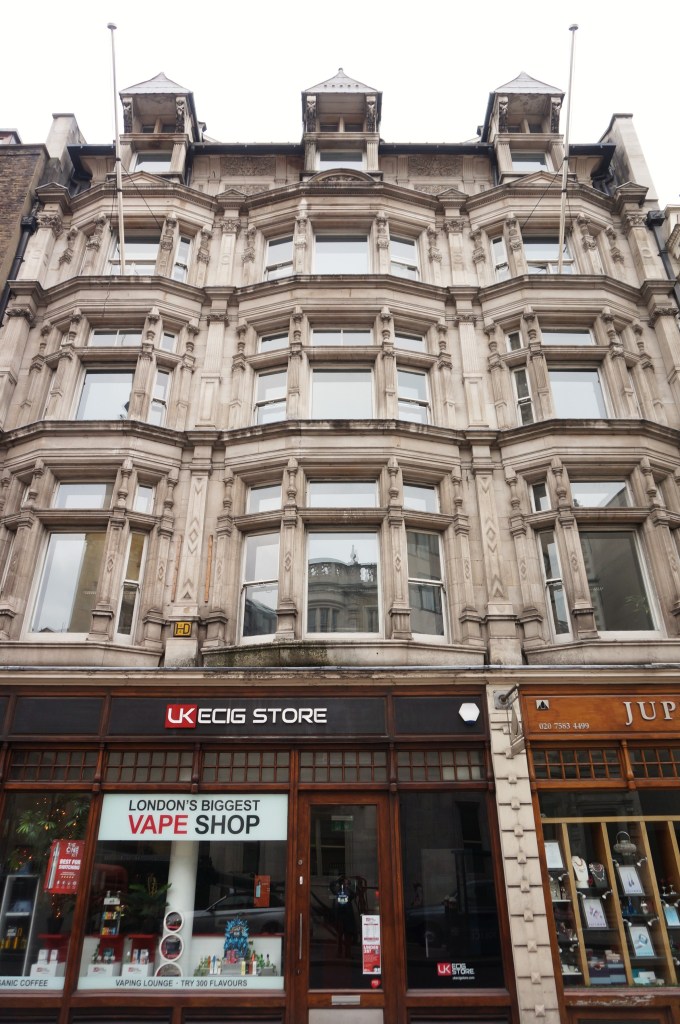 The front was clad in brown Portland stone, but the proportion of window to solid walls suggests that the underlying structure may have incorporated steel framing. Stylistically, it was an essay in Knightley’s early French Renaissance manner, incorporating much intricate and pretty detailing – note especially the reliefs adorning the wall and coving at fourth-floor level. The brackets supporting the projecting roofs of the fourth-floor dormers and the pediments of the dormers lighting the attic space incorporate the goats’ heads depicted on the coat of arms of the Cordwainers’ Company. Other motifs apparently related to the firm of Messrs. Philip. The rear elevations are far plainer and built of stock brick. The building is extant, externally very well preserved – even the shopfronts seem to have survived intact – and listed at Grade II.