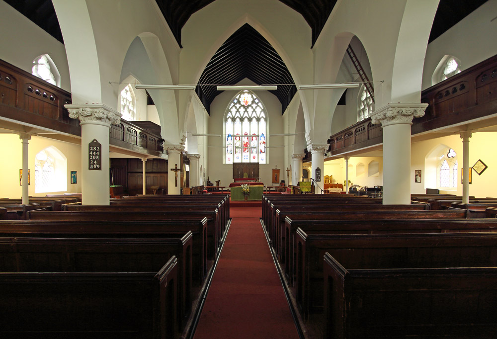 Knightley employed a style based on Tuscan Romanesque with vivid constructional polychromy. The front, with its tiers of arcading, is based on churches such as Pisa Cathedral and San Michele in Foro, Lucca. The side windows have cast iron ‘Lombardic’ tracery with separately cast colonettes on the outside. Externally, the configuration suggests a basilican plan; in fact, Knightley achieved a space unencumbered by internal supports (c.f. Trinity Presbyterian Church) by spanning the space with three lateral semi-circular timber arches made up of 11 laminations, each one formed of two lap-jointed pitchpine planks, and screwed rather than glued together. A monitor roof with a clerestory is carried on the purlins and is slate-hung to lessen the weight on the structure. The wrought iron tie rods are a later addition – the building suffered from structural movement because of the unstable subsoils. Originally invented in the 16th century, laminated timber construction was revived and underwent development from the late 18th century because of its suitability for use in structures where a large unbroken span was required. But although the technology found wide application in civil engineering and industrial architecture, its application to a religious building is unusual. Writing in the mid-1960s, Ian Nairn called St Paul’s ‘an improbably fierce survival’ and ‘a very lovable firework [which] needs to be much better known’ (Nairn’s London). Listed at Grade II in 1973.