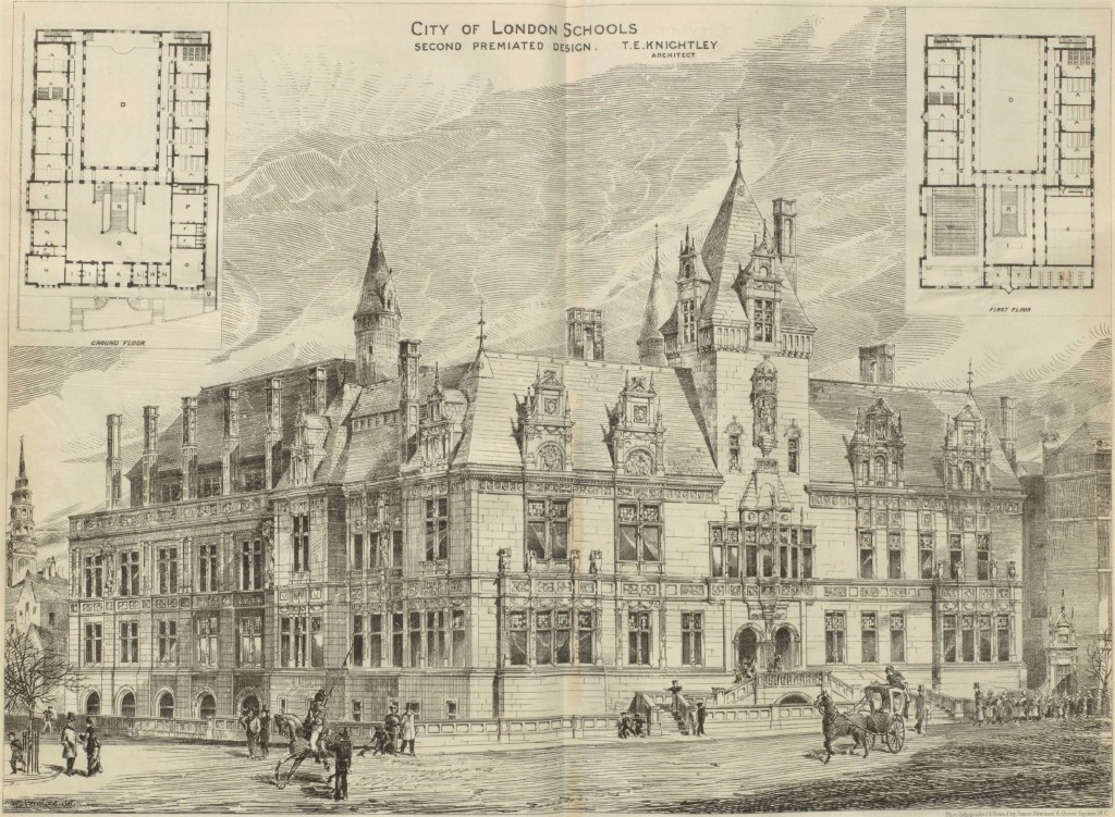 The City of London School owes its origins to a bequest made in 1442 by town clerk, John Carpenter the Younger, which came to be administered by the Corporation of London. It was used to support the education of boys from poor families, but over the centuries the income became progressively less sufficient for the purpose. In the 1820s, discussions began about how it might be put to better use and the eventual result was an Act of Parliament in 1834, which authorised the establishment of a boys’ school at a site on Honey Lane Market. A Georgian Gothick building was erected to a design by J.B. Bunning (1802-1863), who subsequently was appointed architect to the City of London. The school outgrew its premises and, in 1879, the City of London School Act was passed to allow it to move to a new site on the Victoria Embankment, just to the west of Blackfriars Bridge – an unusual move at a time when many such institutions were seeking to move out of central London. A competition was held to find a new design and Knightley’s contribution, entered under the motto ‘Playgrounds’, took second prize, for which he was awarded £200. A photo-lithographed artist’s impression of his design, prepared by William Penstone after the perspective view submitted for the competition and accompanied by floor plans, was published in The Building News of 2nd January 1880.