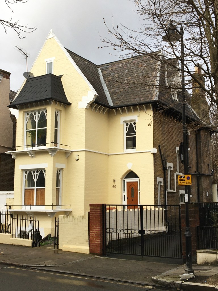However, what appears on the basis of map evidence to be the former manse survives intact at No. 60 Northchurch Road. It is a fairly typical mid-Victorian detached villa, slightly vamped up with details such as decorative glazing bars to the sash windows that form trefoils, elaborate kneelers to the main gable and deep eaves supported on curved brackets. This must have helped to give it visual unity with the Church in a neighbourhood otherwise consisting of houses with stucco classical and Italianate detailing. A report on an architectural exhibition in The Builder of 2nd April 1859 (pp. 229-230) mentions several views by Knightley, praised for being ‘cleverly sketched’, which are grouped under ‘works of actual execution’ and include ‘a parsonage, De Beauvoir Town’. On balance of probabilities and given that it cannot refer to the vicarage of the church of St Mary in the neighbourhood, this seems likely to constitute proof of his authorship.