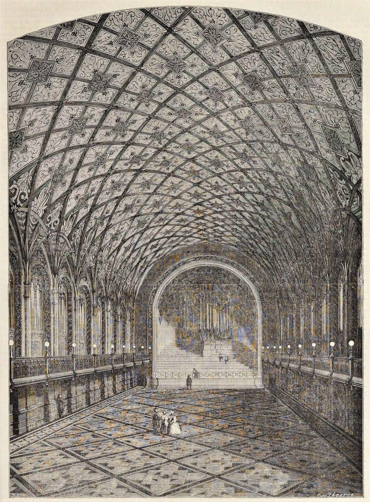 ‘For many years Langham Place has been disfigured by ugly and dilapidated buildings extending from St George’s Hall to Riding House Street. These are now in course of demolition and in their place will rise… a large concert hall designed to accommodate three thousand persons [by comparison, St James’s Hall seated only 2,000]. Questions of light and air obstructed progress, and necessitated placing the area and platform below the level of the street, but the facts that the site is a fine bed of gravel, and the sewer very deep, are favourable points in reference to this arrangement. The first balcony (of which there are two) is on the street level; the entrance, therefore, will be central vertically to the façade. At the level of each floor, on flank and front, in addition to the surrounding corridor, there will be loggie with doors opening on to them and several staircases, so that in the event of fire or panic, escape may be easy and immediate. The loggie will serve also for lounge and promenade. On the lowest floor will be ornamental vestibule, saloon, grill-room, &c.; at the street level, offices and two vestibules; on the first-floor, foyer and saloon, and on each floor rooms for ladies and gentlemen; and above these a small concert-room’. The last of these was the chamber hall, located on the top level of the building.
