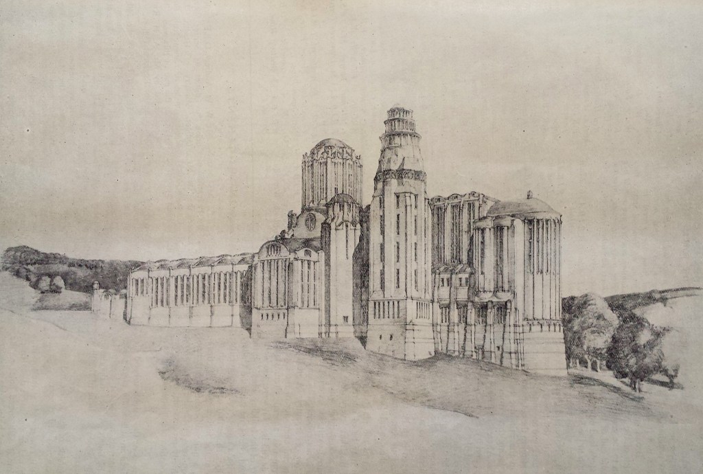In 1924 Goodhart-Rendel converted to Catholicism, and the churches that he built for his faith are among his most important and characteristic works. But what would have been the greatest of them all was fated to remain on paper. Prinknash Abbey was founded in 1928 by a community of Benedictine monks which had previously been based on Caldey Island off the Pembrokeshire coast near Tenby, and which had converted from Anglicanism to Catholicism in 1913. They took up residence in a stately home southeast of Gloucester that until the Dissolution of the Monasteries had been a grange of St Peter’s Abbey, the establishment that Henry VIII turned into Gloucester Cathedral. This was the bequest of another fervent Catholic convert, yet it was only a temporary expediency and around 10 years later, Goodhart-Rendel was engaged to produce designs for a purpose-built complex. It was to be a major statement of Catholic triumphalism – the immense abbey church would have stretched to 300ft (91.4m) in length. Its very construction was to be an act of devotion, since it was intended that the church would be built by the monks and thus the walls were to be solid masonry, finished in honey-coloured local stone. The vaults and domes were to be mass concrete, clad externally in copper.