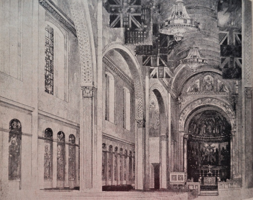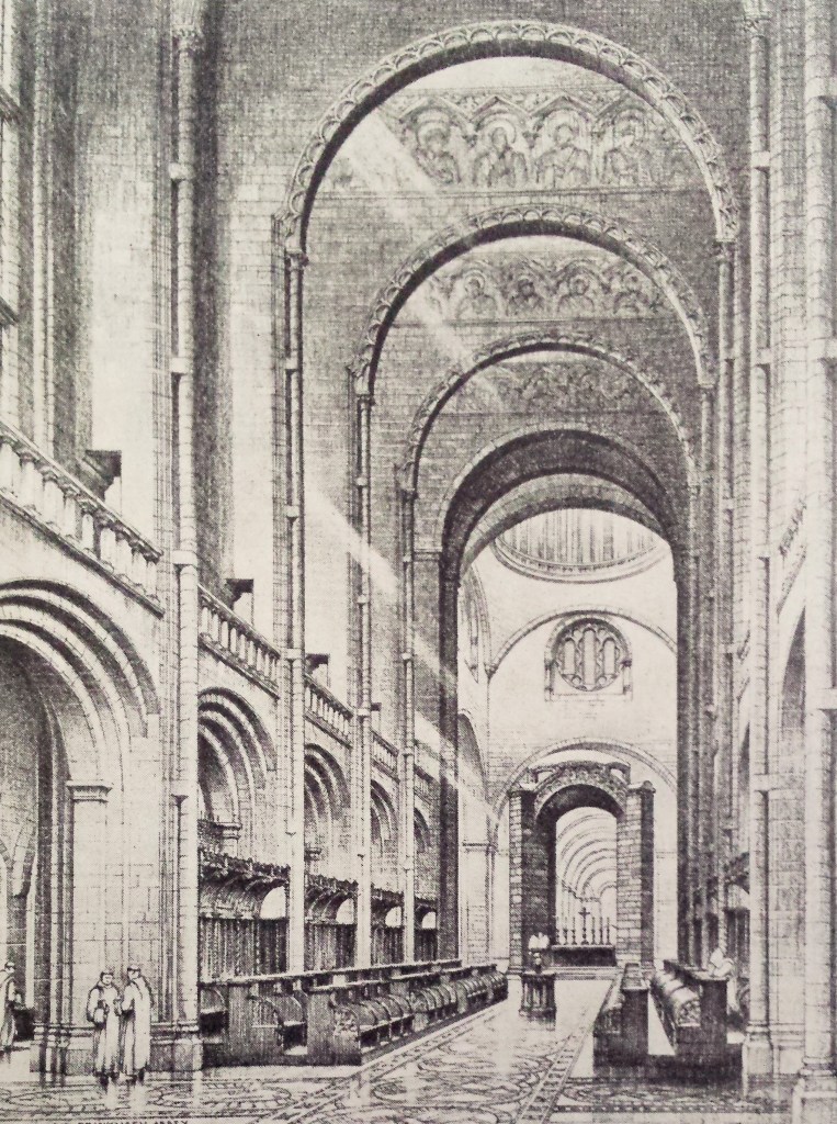 The transverse barrel vaults of the choir were inspired by those of the Romanesque church of St Philibert at Tournus in Burgundy, yet used not for aesthetic effect but to avoid the need for external buttressing. Gothic was abandoned altogether in favour of a highly personal stylisation of Byzantine architecture. This harks back to Westminster Cathedral by J.F. Bentley (1839-1902), a figure deeply admired by Goodhart-Rendel, and perhaps also to the equally sophisticated reinterpretation of the style by Beresford Pite at Christ Church, Brixton. The design went through several revisions and the final version did not appear until 1953. Ground was broken that year, but it quickly became obvious that completion in line with the architect’s full intentions was unrealistic. The lower crypt chapel, where Goodhart-Rendel was buried, was fitted up as a temporary abbey church, then in the 1960s a much scaled-down scheme housing the entire monastery was built on what had been completed of the foundations.