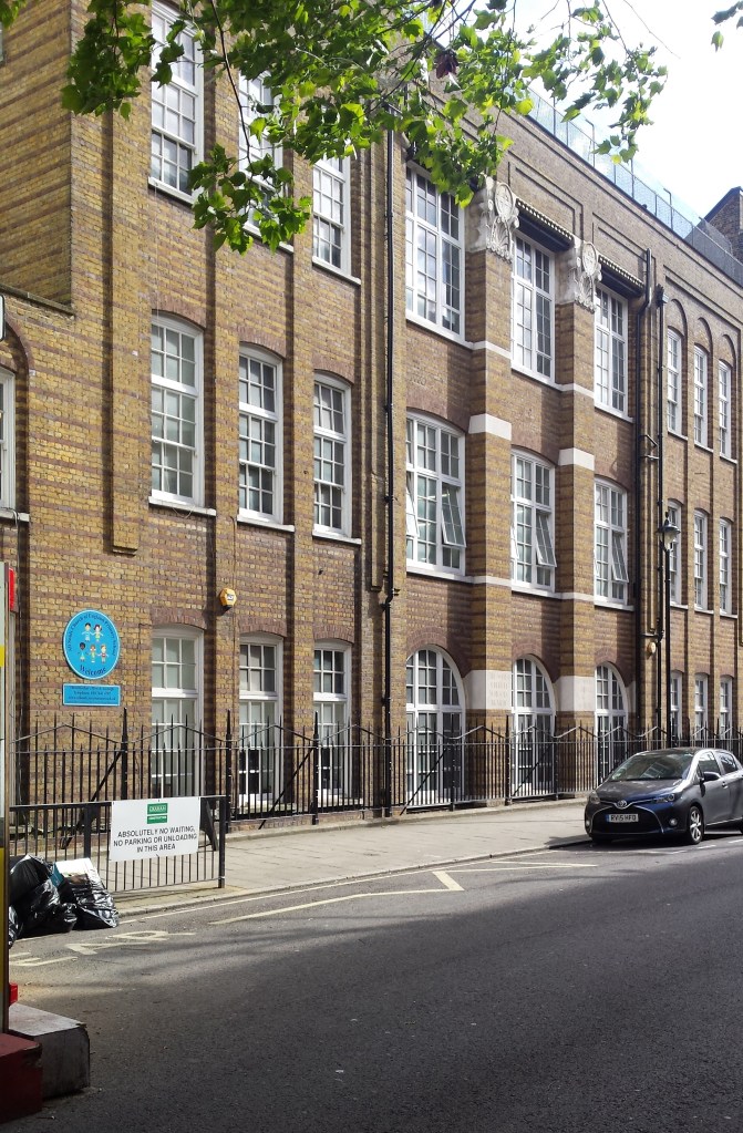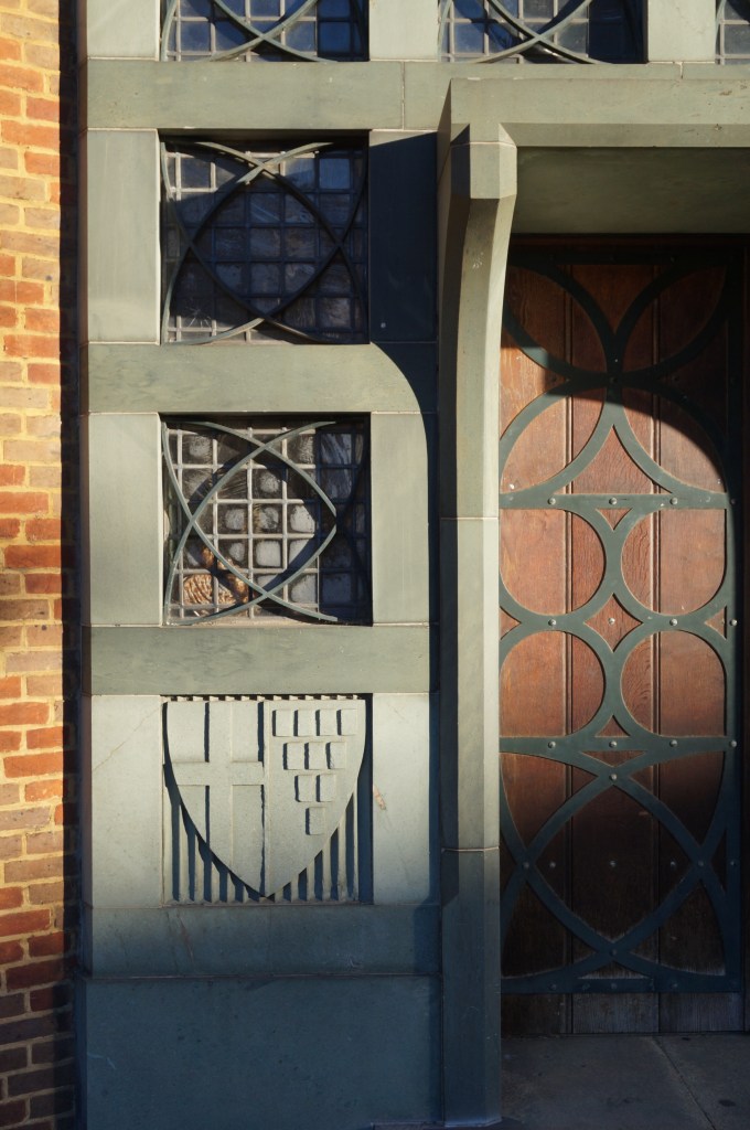 Nothing in the architect’s output from before that date quite prepares one for St Olaf’s House, and indeed the design did not emerge from Goodhart-Rendel’s head fully formed, instead evolving through a series of concept sketches which were initially neo-classical. The building defies easy categorisation and represents a very different response to the gauntlet thrown down by the European avant-garde to what a slightly younger generation of architects, such as the Connell, Ward and Lucas firm, was doing around this date. Of all the stylistic labels attached to it, the only one that describes it adequately is ‘Moderne’. Like Art Deco and unlike Functionalism, it is able to incorporate applied art and ornament, but with greater seriousness of purpose than the Jazz-age decorative trimmings to be found in the former. There is even a touch of the expressionist Amsterdam School in the angularity of some of the modelling. The oriel windows overlooking the river that light the common room and double-height board room are adorned by gilded faience panels mounted on polished back granite entitled ‘The Chain of Commerce’. These were the work of Frank Dobson (1886–1963), who was also responsible for the outline figure of St Olave in black and gold mosaic on the landward side.