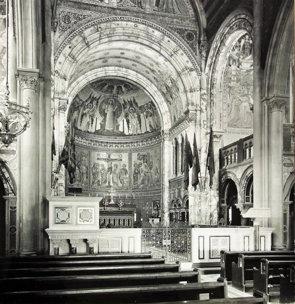 The scheme, completed in 1879, involved the insertion of round-arched arcades and addition of an apsidal chancel in the Italianate Romanesque manner that enjoyed great popularity for military places of worship. The interior was vaulted with alternating ribs of Bath stone and Roman red brick and it was richly decorated. Much of this was the work of Clayton and Bell, who supplied the stained glass and designed the sumptuous mosaics in the sanctuary, which were executed by Salviati. Though the effect of the explosion was devastating, it had left the apse largely intact (reputedly candles lit during the service were still burning when the dust had settled) and it was desired to retain this. Goodhart-Rendel’s design was based on reusing the existing foundations and followed the forms of the pre-war building fairly closely, although it supplanted Street’s neo-Romanesque detailing with overtly classical devices, such as Composite order pilasters and guilloche mouldings to the soffits of the arches. The Doric portico was omitted in favour of a cloister arm extending out at a right angle to a new entrance on Birdcage Walk. This was to be wholly classical in manner, consisting of a series of vaulted chambers with space for monuments to the regiments of the Foot Guards and Household Cavalry, and it was to culminate in a grand narthex enclosing the main entrance to the chapel proper. In the event, only the cloister arm was completed and that not until 1956. The architect’s death seems to have brought the project to a halt and when work recommenced, an uncompromisingly modernist design by Bruce George was substituted, which was eventually completed in 1963.