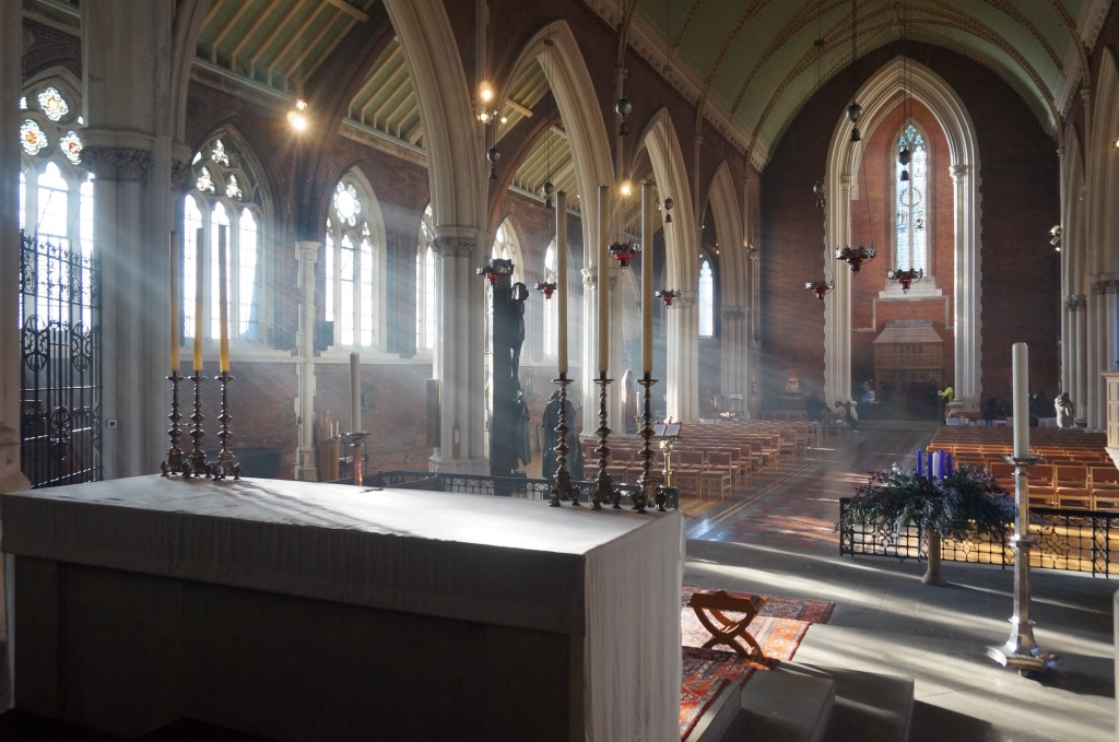 Though liturgically subservient to the main worship space, spatially it is not so since it forms part of a new access route to the interior. It is elongated to the liturgical west with a narthex linking it to an ingeniously contrived two-storey heptagonal porch. This is approached down a narrow passage running between the presbytery and neighbouring residential property, opened up by the demolition of a house that had previously occupied the site. Whereas Travers had shown complete disregard for Withers’ architecture, Goodhart-Rendel responded with great sensitivity: his undemonstrative but subtly detailed Gothic with beautifully executed brickwork is perfectly consonant with it, and the visitor’s progress from the street outside to the interior instils both mystery and drama as a succession of spaces unfolds, all varying in width, height and the level of lighting. The final stage of the journey from the Chapel to the nave though a north aisle with vistas opening up in two directions is a real masterstroke. The architecture is equally carefully conceived in relation to the fittings designed for it – a reredos painted by Colin Gill (1892-1940), altar rails by Betty Joel (1894-1985) and stained glass by Veronica Whall (1887-1967). In 1929, Goodhart-Rendel added a servers’ sacristy on the south side of the apse, but a powerful design for a west tower with a saddleback roof unfortunately remained on paper. This is the first instance of a device that became one of the architect’s trademarks. It had been favoured by William Butterfield (1814-1900), and it says much that in English Architecture since the Regency the author reproduced an engraving by Beresford Pite of that architect’s church of St Alban’s, Holborn, where it had been employed, which depicted the tower rising dramatically out of a squalid and devastated urban setting.