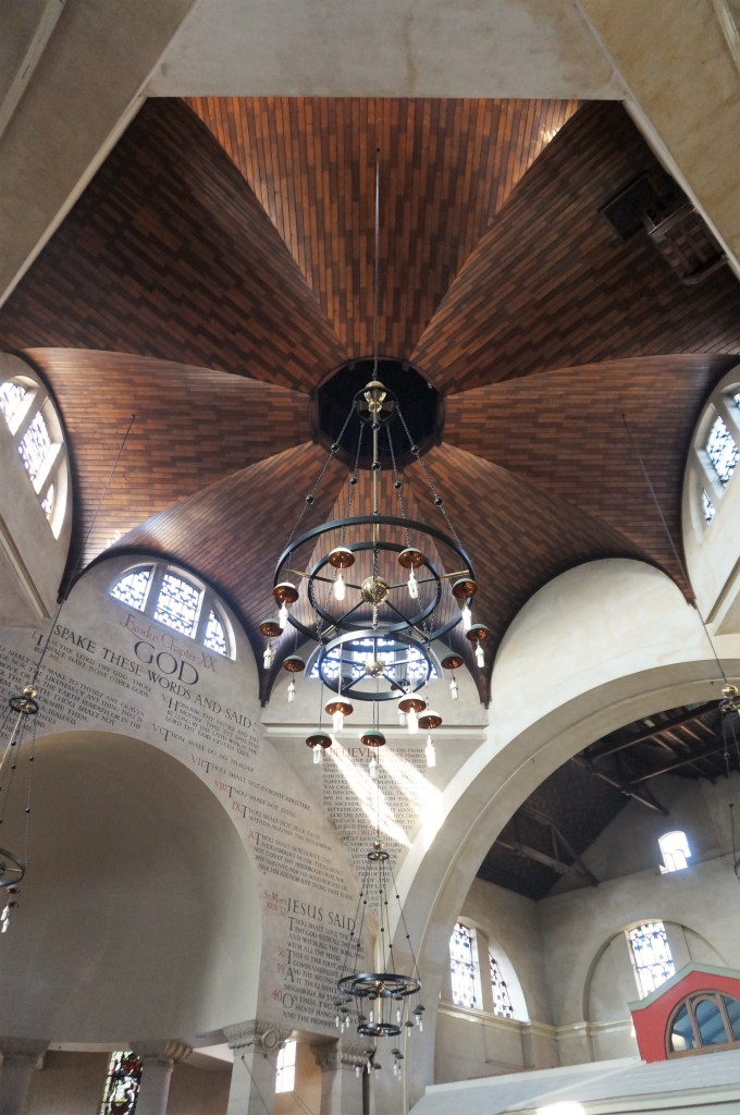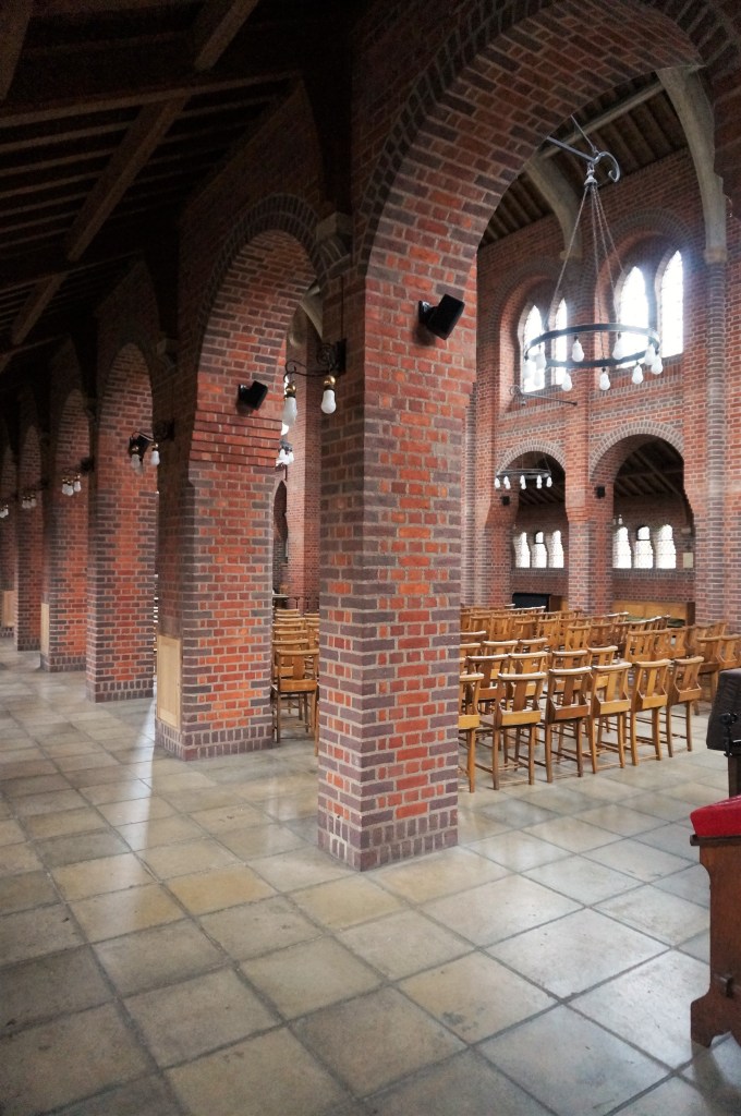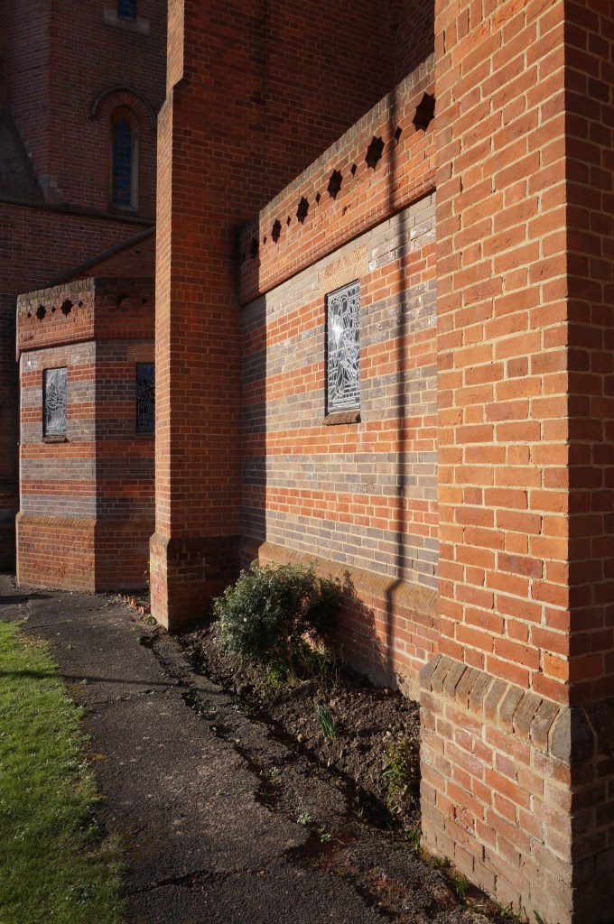 The geometry of the design is organised around equilateral triangles, interpreted as a symbol of the Holy Trinity, and the hexagon, of which they are a constituent element. This is most apparent in the powerfully massed towers of the entrance front, hexagonal in plan and flanking a central arched opening. The device had been used by German architect Theodore Fischer (1862-1938) at his Pauluskirche in Ulm of 1908-1910 (although there the towers are circular rather than polygonal) and a comparison has been drawn on several occasions, although whether Goodhart-Rendel was explicitly inspired by that building is unclear. But for all the intellectual games in the planning and proportioning, what sticks in the memory about the exterior is the direct, very sensual appeal of the constructional polychromy, a dazzling array of stripes, interwoven diagonal banding and reticulation in beautifully executed plum, crimson and steel-blue brickwork, bold and vivid enough to rival Victorian gothic of the 1850s-1860s at its most strident. This is subtly echoed by the geometrical patterning of the leadwork of the plain glass in the lunettes of the nave windows. A towerlike mass with a transverse saddleback roof is heaved up above the chancel to light the space from the sides and above (here, the east window is tiny), a reinterpretation of the device already encountered at St John the Evangelist in St Leonards-on-Sea and used at several other churches.
