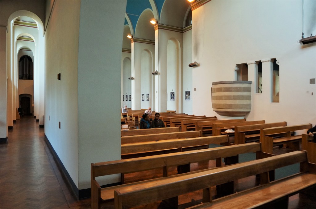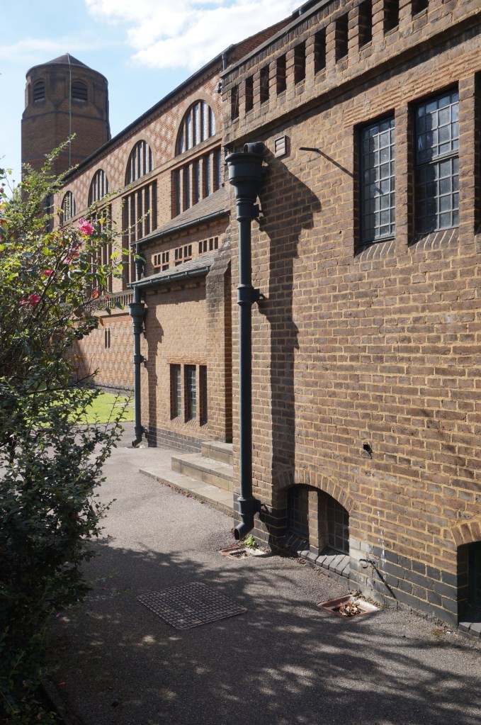 The stately interior has tall passage aisles and transverse vaults of thin concrete. This, together with the concentration of lighting from the south (the north side of the nave is mostly blind) represents the realisation of ideas first tried out in the unexecuted scheme for Prinknash. But whereas there the transverse vaults were to have been horizontal in section, here they rise to follow the curve of the arches that bridge the central aisle. The colour scheme of the interior is relatively muted compared to the exuberant display of the exterior and constructional polychromy is confined to the chancel, where the lower part of the sanctuary is clad with tiers of pilasters on a banded ground of cream and buff stone, incorporating ceramic reliefs by Atri Cecil Brown (1906-1982). The same artist perhaps was also responsible for the monogram of the Trinity set into the east wall, located above the carved and gilt canopy with its coffered soffit; certainly he was responsible for the Stations of the Cross, which were installed in 1971. The banding reappears on the curved front of the built-in pulpit. The tactical use of colour concentrates the worshipper’s attention on the liturgically most important part of the building, although this feels a little overwhelmed by the slightly threadbare overall impression. The pilasters in the sanctuary are fluted and the top cornice incorporates a strange paraphrase of dentilation – one of the few parts of the building capable of being analysed in these terms. Everywhere else, though the reminiscences of historical prototypes – be they Roman, Romanesque, Gothic or Classical – are strong, the effect is to tease rather than to evoke, always allusion rather than direct quotation. The relationship to historicism is every bit as ambiguous as that of St Olaf’s House to modernism.