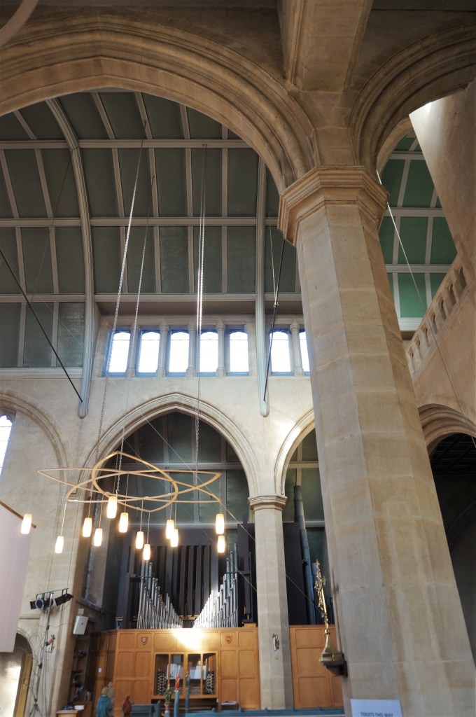 The church is unusual in Goodhart-Rendel’s output for being explicitly Gothic. Though usually inclined not to use pointed arches, which he disliked, nevertheless he was keen to harmonise with what had been retained of the original fabric. Essentially, the building is a large single vessel of broad, lofty nave, with low passage aisles, and only slightly lower and narrower chancel. But great drama and interest are introduced at the junction of these two volumes. A flying arch originally intended to carry the organ and seating for the choir spans the chancel arch about half way up. To either side are unusual openings of one and a half bays into transept-like spaces, which in turn lead through to the side chapels flanking the chancel. Above them are short stretches of clerestory-like fenestration providing lighting from the side and above. The baptistry and font of the Blomfield church were retained and incorporated into the new building, with vividly coloured stained glass by Margaret Thompson (1909-2007) to replace what had been lost. Elsewhere the glass is the work of Joseph Ledger (1926-2010) who supplied unusual designs that are largely monochrome with sparingly, although very effectively deployed spots of colour. Externally the church is powerfully modelled and clad in superb quality brickwork with plum-coloured banding. The almost vernacular treatment of some of the roofing, which incorporates gambrels and catslides, belies the grand scale of the building and maintains visual subservience to Blomfield’s tower.