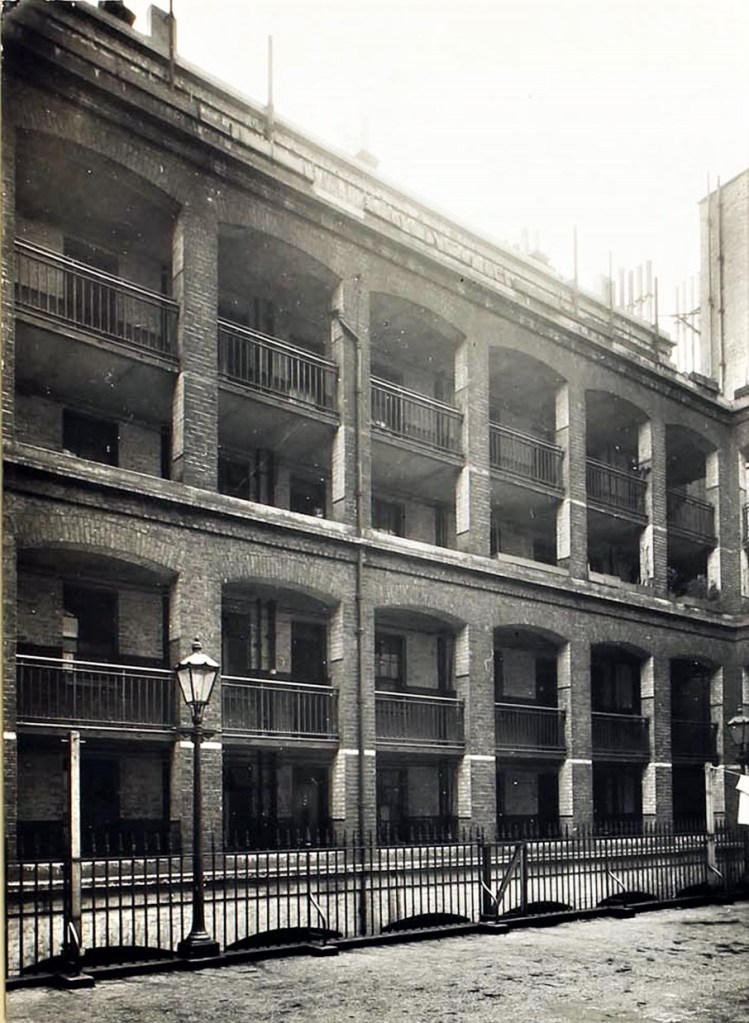 A start was not made until 1863, when a site was purchased on the west side of Commercial Street in Spitalfields. Construction was completed in 1864, the same year that Peabody withdrew from business, taking most of his capital with him. The five-storey block went up on an acutely-pointed triangular site at the junction of Commercial and Folgate (formerly White Lion) Streets, and the project was described at some length in The Builder of 1st August 1863. The Commercial Street wing was to incorporate nine shops with attendant dwellings and store-rooms occupying the basement, ground and first floors. This measure, which took advantage of that wing’s location fronting the busier of the two thoroughfares, was intended to provide income to ensure that the rents for the beneficiaries of the Peabody Trust were kept low. The dwellings for the poor were located above the shops on the second and third floors, and were served by a separate entrance – effectively a ‘poor door’ in modern parlance. The Folgate Street wing was entirely occupied by dwellings for the poor. As at Columbia Square, the layout was based on a corridor plan and the topmost floor housed laundries with a drying area, a children’s playground and other communal facilities. The accommodation was reported to comprise three single rooms, 47 two-room sets and 17 three-room sets. The living rooms were 13ft by 10ft (4m by 3m) in size, and equipped with a range, oven, boiler and hot plate, while the bedrooms were 13ft by 8ft (4m by 2.4m). Toilets were shared, one to each pair of families. There were dust shafts for the disposal of rubbish that ran down to dustbins in the basement, a porter’s lodge and a cooperative store.