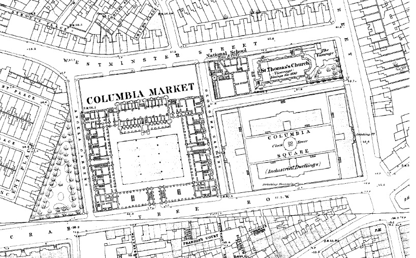 The market was ceremonially opened amid much pomp on 28th April 1869, having cost over £200,000 to build. But it was disastrously misconceived in several different regards and Burdett-Coutts’ good intentions misfired. Local businessmen opposed the scheme and prevented wholesalers from supplying the market. In the interests of religious propriety, Sunday trading was prohibited; in fact, this was one of the mainstays of the local economy. The venture quickly failed and by the end of 1869, Burdett-Coutts had been forced to concede defeat. In February 1870 Columbia reopened as a fish market, but it could not hold its own against Billingsgate and again failed. The following year, the site was handed over to the Corporation of London, but as far as that body was concerned it was a white elephant and the complex was returned to Burdett-Coutts in December 1874. Undeterred, she reopened it the following year under an arrangement with three of the largest railway companies, but opposition, notably from Billingsgate fish market, was again too strong. After an unsuccessful attempt at a Columbia Meat Market in 1879, a more ambitious attempt at reinventing the enterprise, this time as the London Fish Market and National Fishery Company, was begun in 1881, which involved obtaining an Act of Parliament to connect the site to the railway network. The scheme foundered and went into liquidation in 1884. The following year, Columbia Market ceased trading for good. In 1915 the site was purchased by the London County Council, which rented it out as warehouse space and accommodation for light industry. No new use which might have brought the complex into its own ever emerged, and between 1958 and 1966 both the market and Columbia Square were cleared for the construction of a new housing complex.