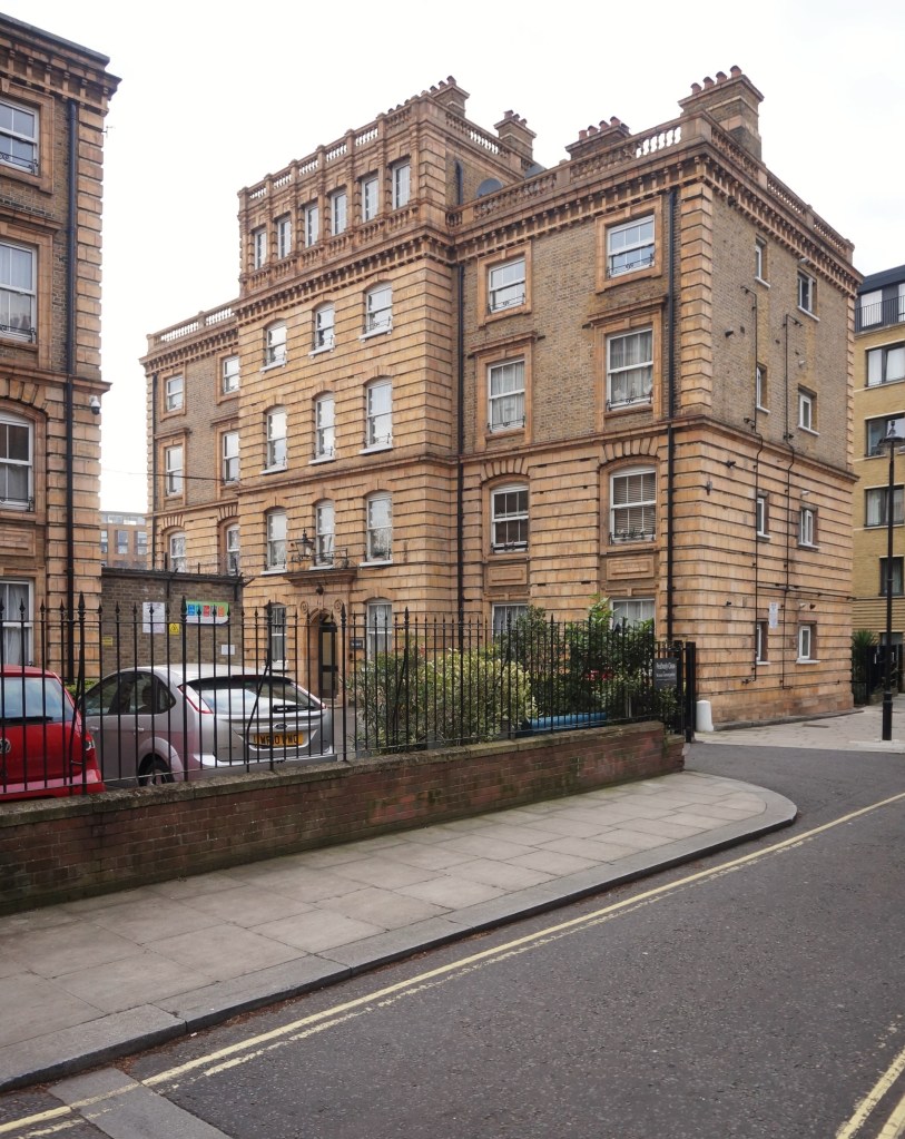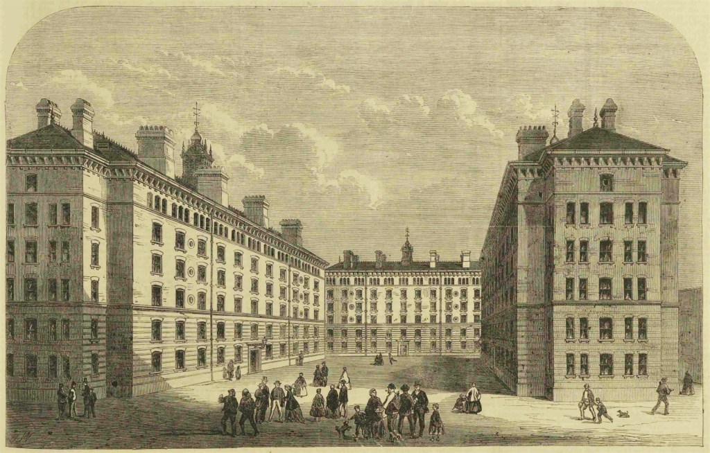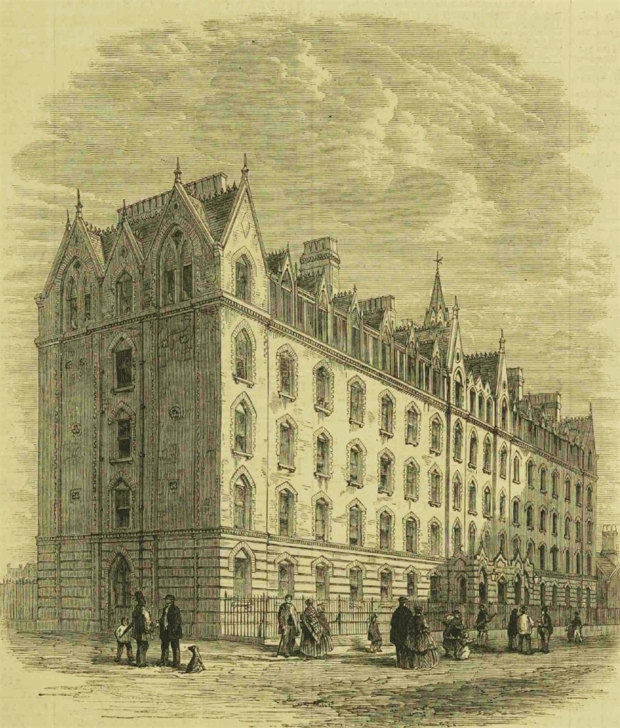 The young Burdett-Coutts showed great independence of mind and had a powerful social conscience, shaped by her father’s views and shock at the urban poverty portrayed in Dickens’ novels. It was he who drew her attention to the ragged schools for the poor, which she began to support in 1844. In 1847 the two of them founded Urania Cottage in Shepherd’s Bush as a refuge for homeless women, many of whom had been prostitutes. Around 1851 she conceived the idea of building a complex of model housing in Nova Scotia Gardens in Bethnal Green, a location deliberately chosen for being the most infamous slum in an already notorious area. It seems that she initially had in mind a model village and approached Philip Hardwick (1792-1870) for a design. This changed after she visited at Dickens’ instigation one of the complexes of model dwellings in central London designed by Henry Roberts (1803-1876) for the Society for Improving the Conditions of the Labouring Classes. Dickens was convinced that apartment blocks – at that date, a novel form of housing in England – represented a more economical use of land and would be easier to maintain and equip with proper services. His thinking seems to have been influenced by his brother-in-law Henry Austin, (?1812-1861) an architect and civil engineer who had witnessed first-hand the wretched living conditions in the East End while engaged on the construction of the Blackwall Railway for Robert Stephenson. He was convinced that better sanitation, enforced through improved legislation, was the key to improving them.