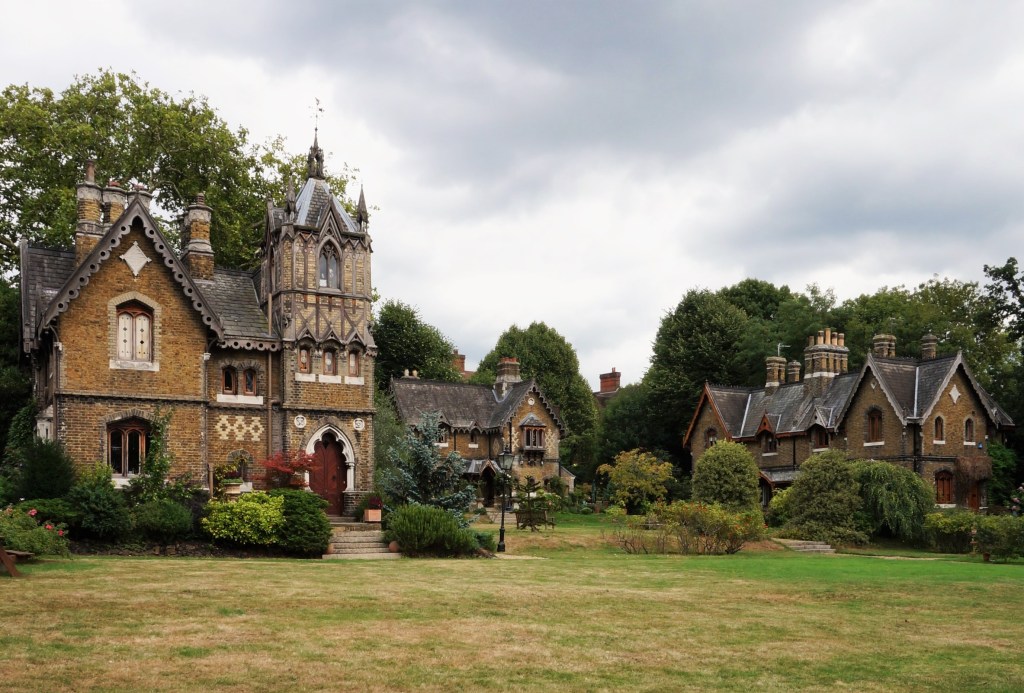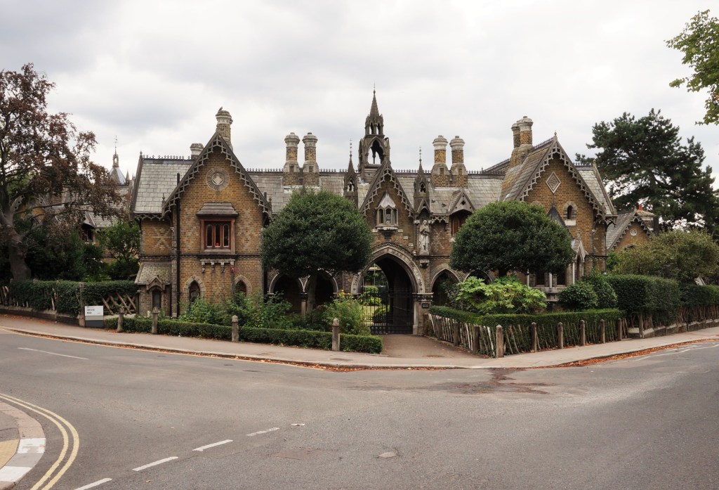 But though Columbia Market proved to be ill-starred, the working relationship of Burdett-Coutts with Darbishire flourished and she commissioned another complex of model housing from him, this time aimed at a very different demographic. In 1849 she had taken up residence at Holly Lodge, the house on the southern edge of Highgate Village in then-rural Middlesex that Thomas Coutts had bought for Harriot Mellon back in 1808. Its extensive grounds occupied all of the area between West Hill and Swain’s Lane, where they bordered Highgate Cemetery, one of the Magnificent Seven. Around 1865, Burdett-Coutts embarked on a project to put up a model village on a triangular site at the junction of Swains Lane and Chester Road, just beyond the southern tip of the east cemetery. Whether this was a philanthropic or commercial venture is not entirely clear: reputedly the housing was originally intended for workers on the Holly Lodge Estate and clerks of Coutts Bank, but the rents charged on the properties were such that they were effectively excluded from the outset. After Burdett-Coutts died, her husband sought to dispose of the estate and in 1921, just before it was finally sold off for residential redevelopment, Holly Village was purchased by its tenants.