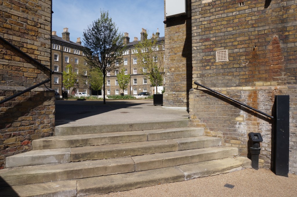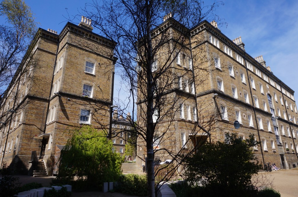 Columbia Square, the model housing complex for Bethnal Green, went up on a site located a short distance to the northeast of Shoreditch High Street on a thoroughfare then known as Crab Tree Row (later renamed Columbia Road). It took the form of four elongated five-storey blocks arranged around a central courtyard. The first to be completed was the east block, which opened in April 1859, followed by the west block in July 1860, the north block in 1861 and the south block in early 1862. They provided a total of 183 dwellings – mostly two-room sets consisting of a living room with a boiler, range and oven, and a bedroom, although single rooms and three-room sets were also available. Each floor was based on a corridor plan, while vertical access was afforded by staircases whose wells and landings were open to the outside. At a time when disease was still widely believed to be spread by miasmas, allowing as much fresh air and sunlight as possible to penetrate to the core of the building was regarded as essential.