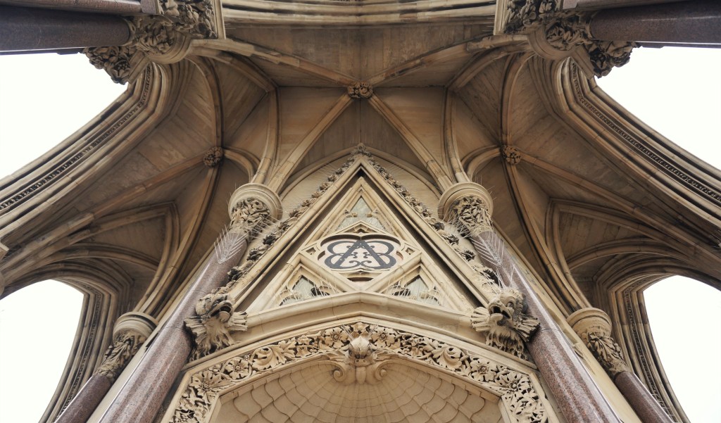 The site chosen for the fountain was a prominent location more or less in the centre of the park, intercepting a route running across it from the Gunmaker’s Gate on the Bow side to the Royal Gate West in South Hackney. It was a lavish commission, which cost over £7,000, and Darbishire’s design made a show of the benefactor’s munificence. Rising to slightly over 58ft (17.7m) in height, it was designed as an octagonal pavilion, with a central pillar encircled by an arcade, each bay of which has a quadripartite rib vault. Polished red granite was used for the piers of the arcade and the shafts from which the vaults spring on the inner side. There is much inlaid decoration, including an inscription recording Burdett-Coutts’ gift and her monogram in several places.
