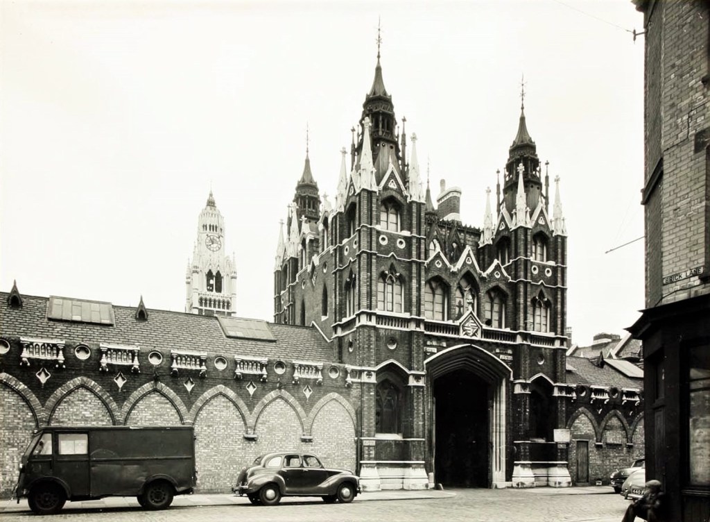 The brickwork incorporated constructional polychromy and was tricked out in stone and terracotta dressings. Contemporary reports describe the style as ‘Domestic Gothic’, but Darbishire’s treatment of the Middle-Pointed idiom was not uniform. The interior of the main market hall had clearly been informed by careful study of English Geometrical Decorated Gothic of the late 13th century and had a distinctly ecclesiastical air. But elsewhere Darbishire’s Gothic was of a wilful, decidedly roguish bent, such as the extraordinary forms of the first-floor windows above the main vehicle entrance. Though much of the complex was essentially classical architecture in fancy dress, Darbishire’s powerful imagination lent it maximum visual interest by moulding the forms into keeps, gatehouses, turrets and cloister arms, with each elevation articulated into an endless series of advancing and receding planes. This reached its apogee in the thrilling skyline of gables, dormers, pinnacles, cupolas and spires. From a distance, the complex resembled a small city and within, the market square had the air of a Flemish Grand Place with its own belfry and cloth hall. ‘No verbal description could convey the strangeness and unlikelihood of it all’, wrote Geoffrey Fletcher of Columbia Market in The London Nobody Knows.