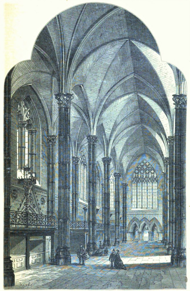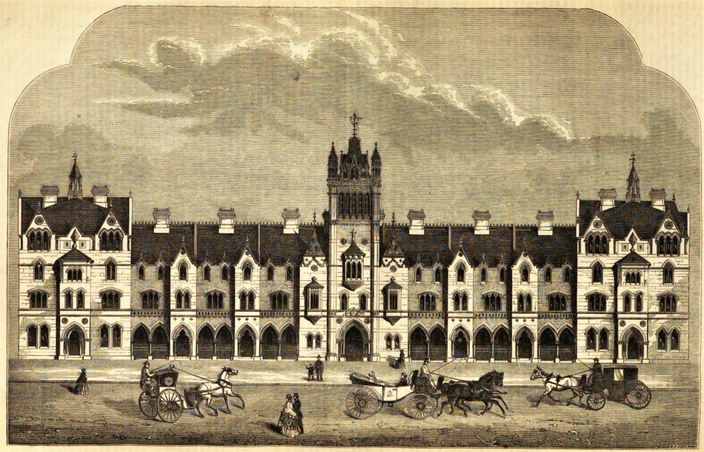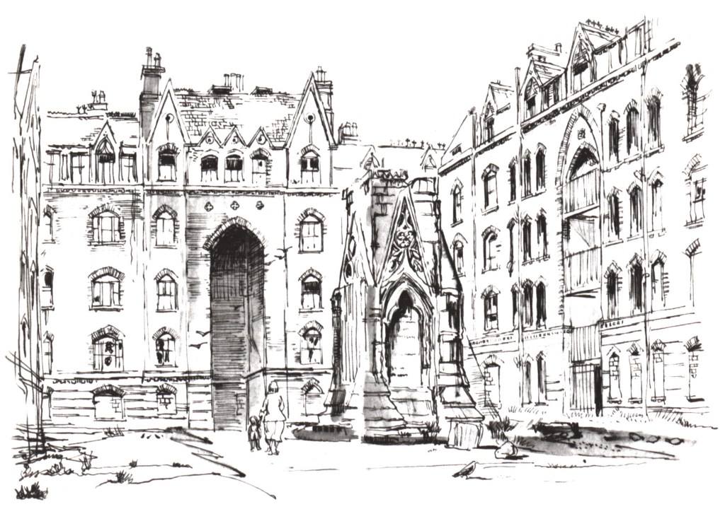 The buildings were constructed of brick and essentially classical in their composition, with symmetrical front and rear elevations, a cornice to mark off the attic storey and even rustication to the ground floor. But much of the fenestration had pointed arches, as did the four storey-high recess in the centre of each of the inward-facing facades, and this was complemented on the top floor by a multitude of steeply pitched dormer windows and gables, as well as sparingly deployed Gothic tracery, to give the blocks a vivid skyline. At least one of them seems to have had a centrally-placed flèche. This did not save the inner courtyard from dourness and to relieve it, as a finishing touch a clock tower was put up in the centre, handled in Decorated Gothic forms that seem to have taken their cue from the Eleanor Crosses. It was as abundant in its ornamentation as the elevations that overlooked it were parsimonious. Rising to 35ft (10.7m) in height, it was built of Aubigny stone.
