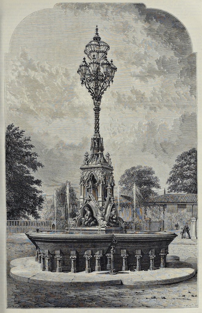 Darbishire’s last known commission for Burdett-Coutts was another drinking fountain, this time in Regent’s Park on the north side of the Outer Circle opposite what was at that point the main entrance to London Zoo. It was illustrated and described at some length in The Builder of 20th May 1871. Its four basins of polished red Aberdeen granite formed a quatrefoil in plan and were supported by (no doubt purely cosmetic) dwarf columns, also of red granite but with capitals of Sicilian marble. The plinth incorporated dog troughs of gun metal and there were also standpipes for watering horses – a reminder that animal welfare was among the many causes that Burdett-Coutts supported. As at Victoria Park, the drinking water was dispensed from the mouths of porpoises and from water jars carried by small boys, all carved in marble. A tabernacle-like structure in the centre supported a tall cast-iron lamp standard, with a large central lantern rising to a height of 24ft (7.3m) surrounded by eight smaller ones. ‘The workmanship throughout is remarkably good’, reported The Builder. ‘The metal work is fine and cleanly cast, and richly gilt; and the granite and marble work is some of the best which has been executed in London’. The fountain disappears from Ordnance Survey maps in the 1950s and not a trace remains today on the site, which is now a car park and has been absorbed into London Zoo.