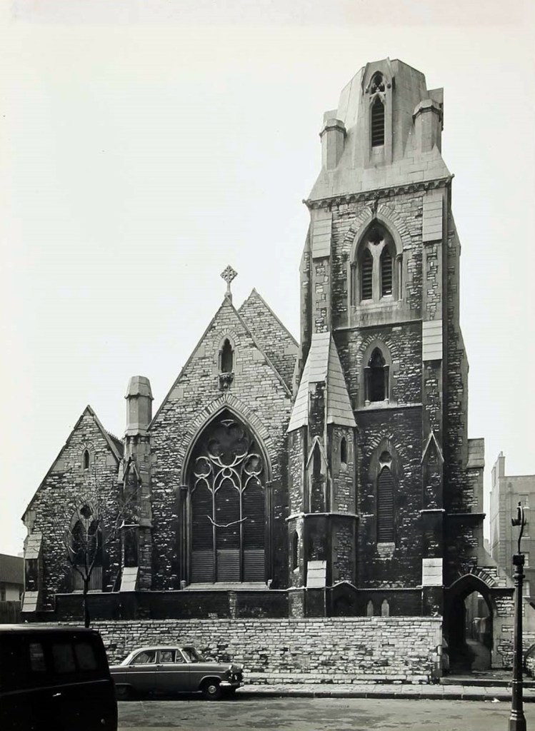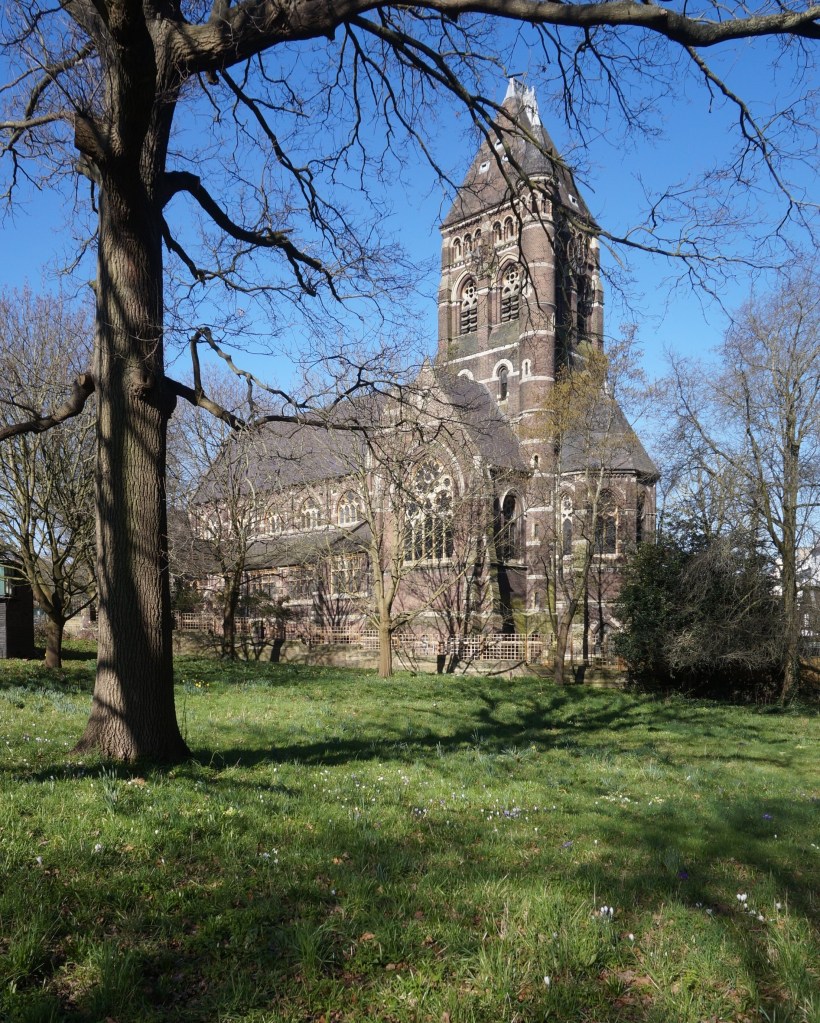 But Teulon was not merely highly inventive in his treatment of historicising motifs, he was also omnivorous in his sources. At St Andrew’s, Coin Street in Lambeth (designed 1854, consecrated 1856), he turned for inspiration to the Backsteingotik churches of the Hanseatic cities of northern Germany. This is particularly evident in the tower, which lacks any buttressing – as is the case with the prototypes – and where tall gables to each elevation of the belfry stage help effect the transition from square tower to octagonal spire. Teulon had first tried out a Rhenish helm spire at St Stephen’s, Manciple Street in Southwark of 1848 (demolished 1965): in most other respects, that was an unadventurous design, but when he used the device again 17 years later for the rebuilding of SS Peter and Paul, Hawkley in Hampshire, it formed part of a striking and convincing essay in neo-Romanesque with decidedly Germanic overtones. Perhaps he had been prompted by recollections of something that he had seen on his travels as a young man. It is likely that he had seen for himself Romanesque buildings in the Rhineland, and one of the sketchbooks in the RIBA Collection includes a view of Friedrich August Stüler’s SS Peter and Paul in Wannsee outside Berlin, a Rundbogenstil design completed in 1837. At St Mark’s, Silvertown (now the Brick Lane Music Hall) of 1860-1862, Teulon cast his net even wider, filling the belfry windows and those below lighting the chancel with square-section tracery in geometrical patterns that recall the openwork screens in Moorish architecture. Something similar, although interpreted even more personally, cropped up at St Thomas’s, Agar Town in Camden (1863, demolished c. 1960 following bomb damage). Islamic inspiration is evident again at St Stephen’s, Rosslyn Hill in Hampstead (1869-1873), where Teulon used horseshoe-shaped arches to carry the tower.