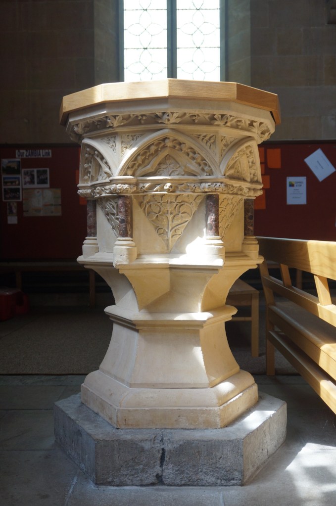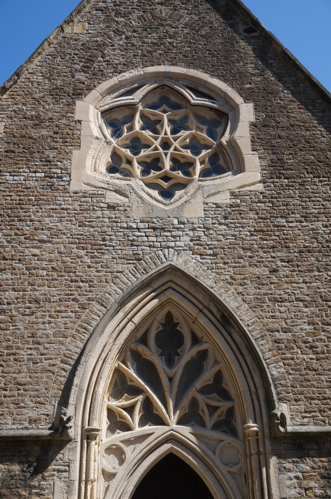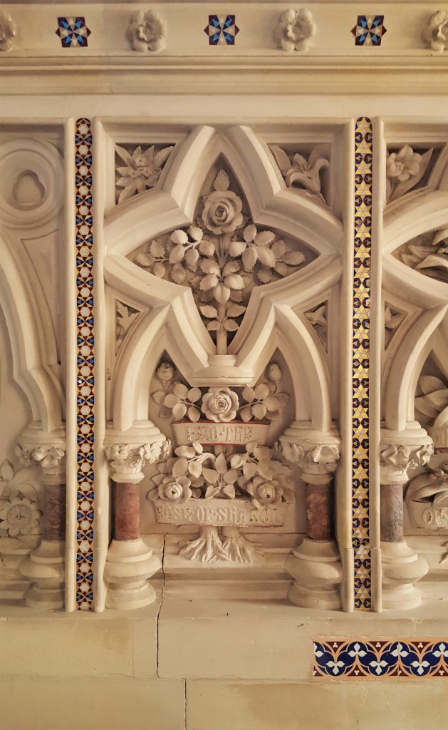 Teulon pursed a total aesthetic in his churches every bit as avidly as any other 19th century architect. Fittings were usually bespoke and their design is full of the invention and originality that characterise the architecture which forms their setting. He also collaborated extensively – and by no means exclusively on ecclesiastical commissions – with leading artists and craftsmen of the time: Thomas Earp (1828-1893) for sculpture (the reredos that he executed for St John the Baptist, Huntley was shown at the Great Exhibition of 1862), Clayton and Bell or Lavers and Barraud for stained glass, Skidmore of Coventry for ironwork and Salviati for mosaics. At Ealing, Huntley, Netherfield and St Thomas’s in Wells, he used unusual tinted glass with monochrome drawing supposedly of his own devising.