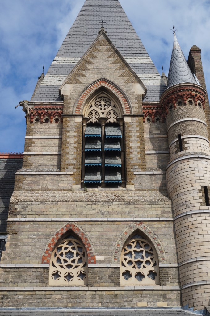 The Puginian style of the 1840s is pulled around, distorted, perverted and ultimately made into a parody of itself. Curvilinear tracery gets more intricate, sinewy and tangled; cusping gets larger or more acute; motifs are piled up, superimposed, collide with and puncture one another. Components which in the original would be subsidiary to the composition as a whole, such as stair turrets and transverse gables, take centre stage, while utilitarian features such as clock faces and boiler house chimneys become vehicles for invention and are treated as architectural statements in their own right. Everywhere the trend is towards complexity, even fiddliness, towards never using one word where ten will do. Ornament, especially architectural sculpture, is exaggerated and overscaled. At St John the Baptist, Netherfield in East Sussex of 1854-1855 the pot is simmering; at Holy Trinity, Hastings of 1857-1862, it is boiling over. The apotheosis of this manner is St John the Baptist, Huntley in Gloucestershire, a medieval church rebuilt in its entirety apart from the tower in 1862-1863, whose sumptuous interior is thoroughly baroque in its profusion of ornament and colour.