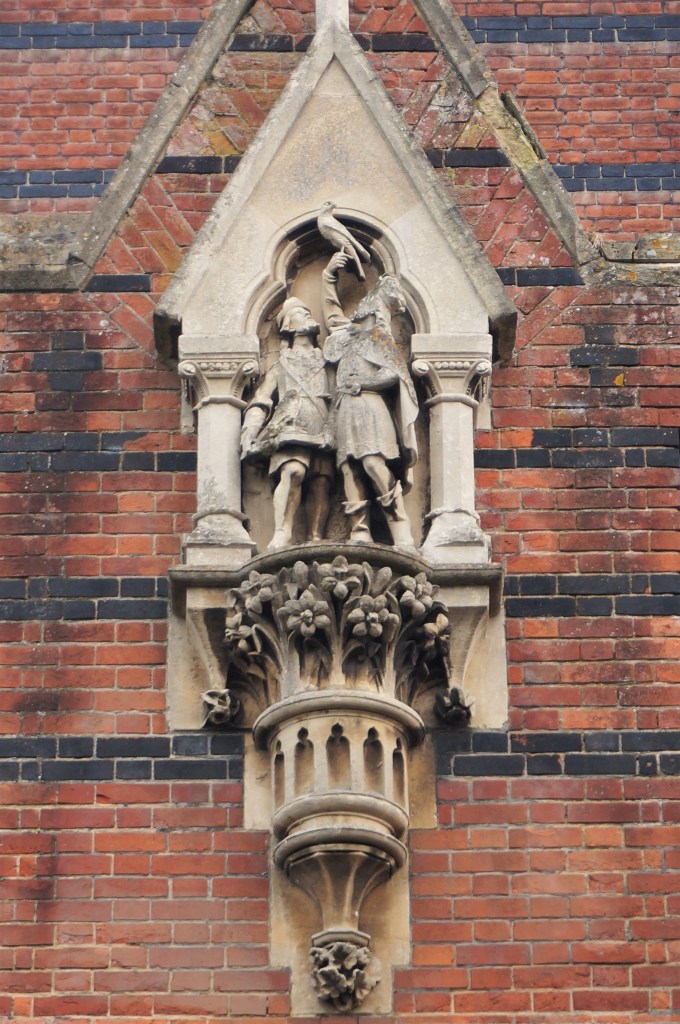The style is Teulon’s almost hallucinogenic reinterpretation of Puginian Gothic with delight evident from every view in his excursions into complex geometrical forms and restless variations in outline and detail. Architectural sculpture, much of it by Earp, plays an important role. Though the flint flushwork pays lip service to local traditions, it is simply more grist to Teulon’s mill in creating exhilarating variations in texture, colour and material. The estate remains and is used as a stud farm for racehorses, owned until his recent death by Sheikh Hamdan bin Rashid Al Maktoum, but the house is now in poor condition after a lengthy period of neglect.