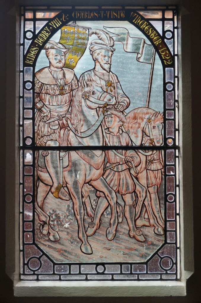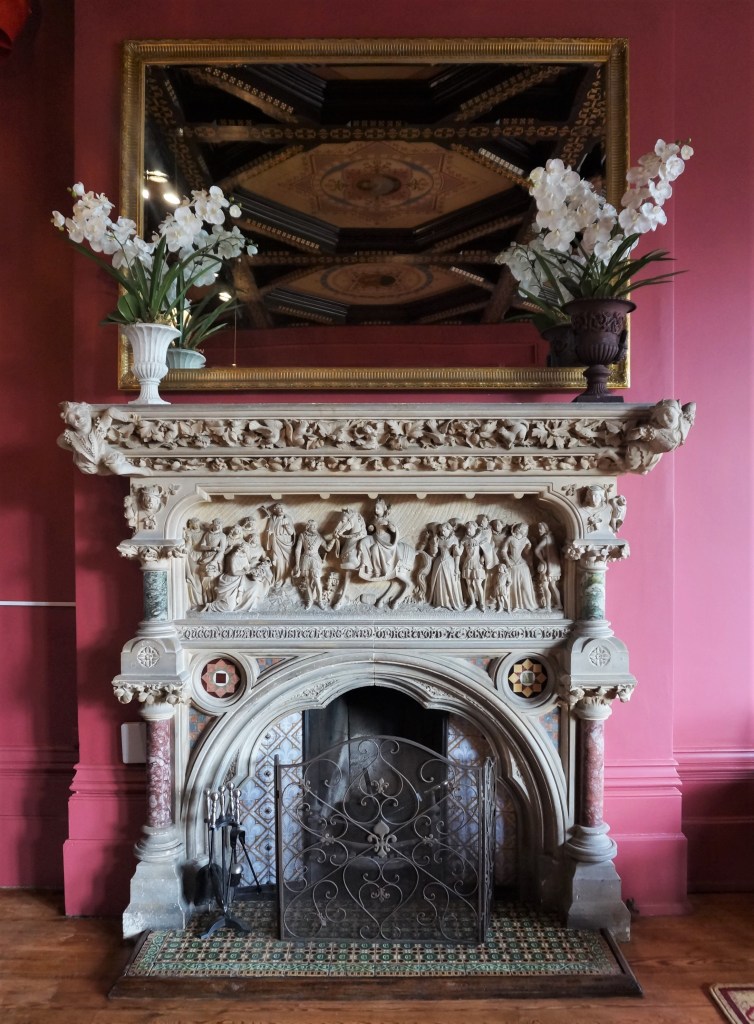 Yet Teulon’s omnivorous approach does not translate into stylistic indeterminacy since all these features are subsumed into a compelling, strongly individual whole. The boldly asymmetrical composition is modelled in powerful, chiselled forms, with stridently patterned polychromatic brickwork, produced in kilns set up on the estate, pullulating in each elevation. Whatever the historicising overtones may be, the aesthetic is distinctly and unmistakably High Victorian, capable of being ascribed to no century other than the nineteenth. It is sustained throughout all Teulon’s numerous buildings and structure on the estate, which include not only the mansion and stable block, but also a bridge across the River Hart, walls and steps in the pleasure grounds, estate housing and even a water tower. The church of St Mary a short distance away to the east in the grounds had been rebuilt in neo-Norman by Henry Roberts (1803-1876) in 1840-1841. Teulon’s brief here seems to have been confined to adding architectural sculpture to the spire, turning Roberts’ design into a haunting, even unsettling presence, adding to the vivid skyline of the ensemble. The interior of Elvetham Hall strikes a more light-hearted tone. Pageantry abounds in the extensive scheme of figurative art, executed in a variety of media, which celebrates events in the long and illustrious history of the house, notably the lavish reception put on for Elizabeth I and her retinue by the Earl of Hertford, the then-owner, in September 1591. The great hall incorporates an extraordinary apse-like alcove lit by tall lancets and glazed with Teulon’s distinctive monochrome stained glass, making it a secular counterpart to the baptistry at St Mary’s in Ealing.