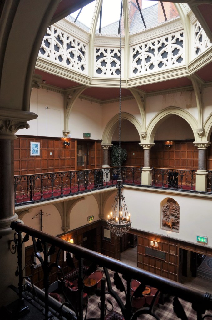 The servants’ hall that extends along the north side of the cour d’honneur is treated as a discrete form and terminates at one end in a tall crow-stepped gable and spired bell cote, giving it an ecclesiastical air that might lead a casual observer to mistake it for a domestic chapel – something noted, greatly to its displeasure, by The Ecclesiologist. Even allowing for the impact of later alterations, the eschewal of symmetry in the elevations and axiality in the composition is the defining feature of views from any angle, making a perambulation of the grounds a decidedly disorientating experience, something accentuated by the sharp fall of the land on the garden side. The love of sculptural invention is again evident, especially in the hyperactively busy composition of the entrance tower with its intricate buttressing and oriels. The house originated as a hunting lodge in a royal park, which had reputedly been granted by Charles II to Nell Gwynn, his mistress and mother of the 1st Duke. As at Elvetham Hall, episodes from the past history of the site and local legend informed the decorative scheme, the sculptural elements of which were once again executed by Thomas Earp, this time in red Mansfield stone. The base of the oriel window above the main entrance incorporates portrait busts of Robin Hood and his Merry Men, while a relief in the Great Hall depicts Edward III hunting in Bestwood Park.