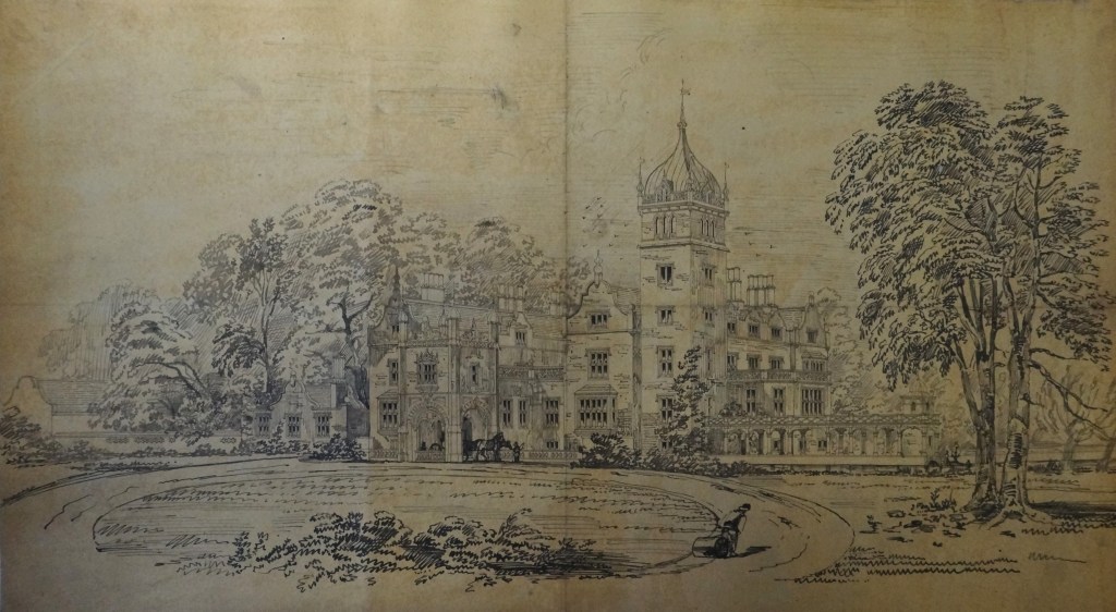It is the churches that have made Teulon’s name. Yet he was also an important designer of country houses, which demonstrate his artistic development and embody his mature style every bit as vividly as any of his ecclesiastical commissions. The attention of architectural scholars has tended to be drawn by a quartet of major works. The earliest is Tortworth Court near Wotton-under-Edge in Gloucestershire, built for the second Earl of Ducie in 1849-1853 and Teulon’s first known large-scale venture in the field. It is the product of an architect – and, indeed, of an age – that had neither fully relinquished the fashions of a previous age nor wholly assimilated the innovations of the new one that was already upon them. A drawing in one of the sketchbooks in the RIBA Collection depicts an intriguing design for what is essentially an oversized cottage orné, based on a cranked axis, with a caption in a much later hand stating that it is Tortworth Court. If this was indeed Teulon’s initial offering to the Earl, then the concept evidently changed radically in the design process.