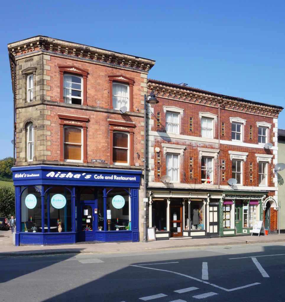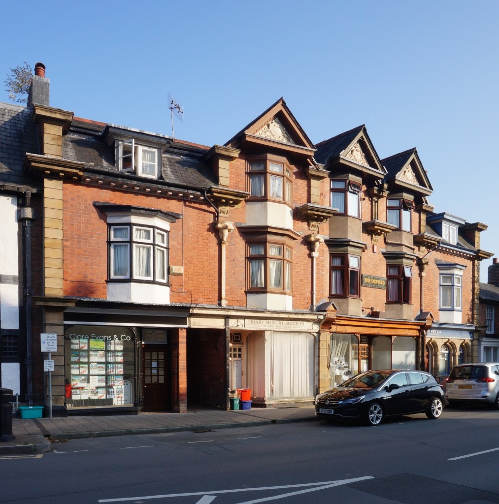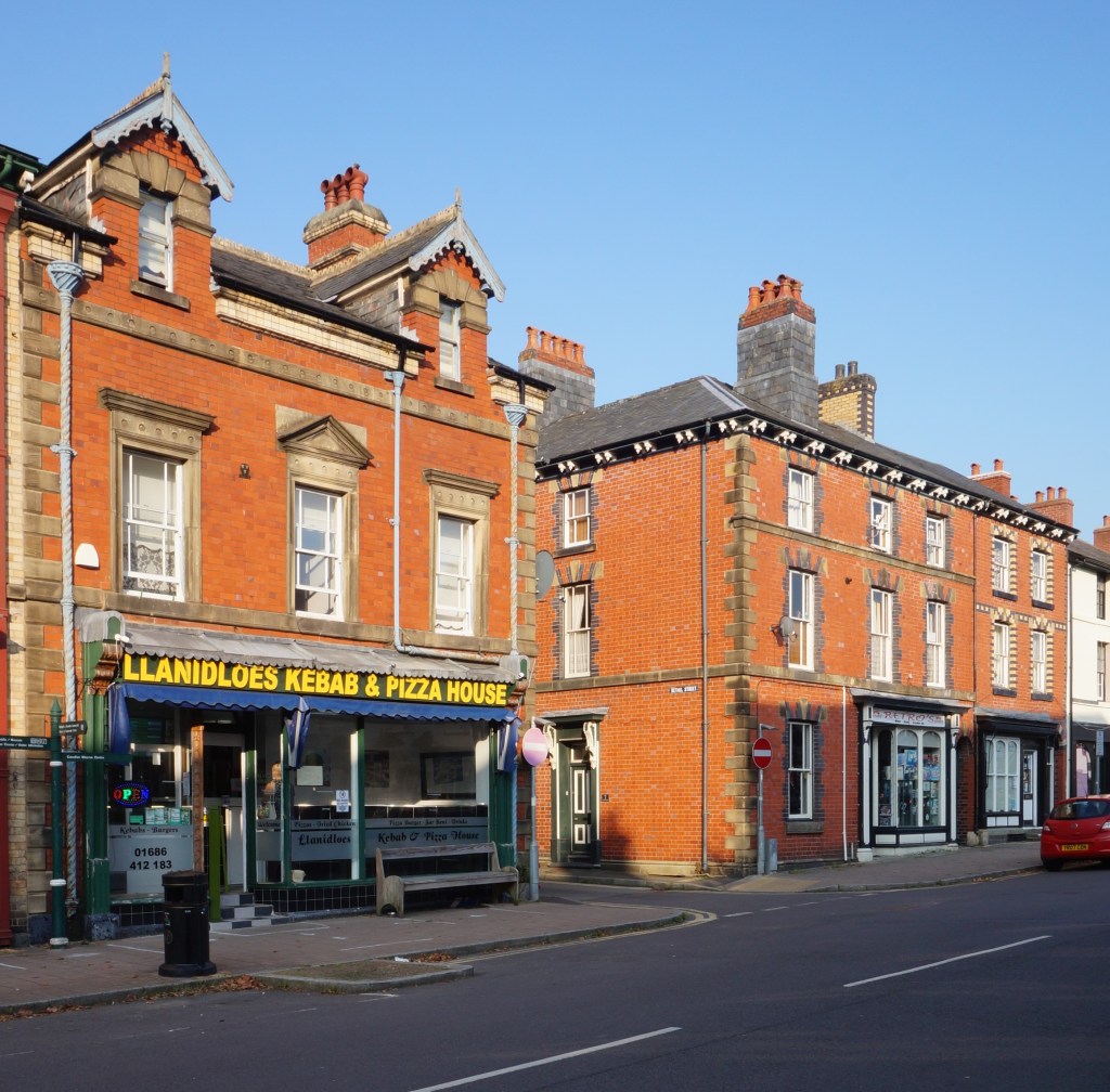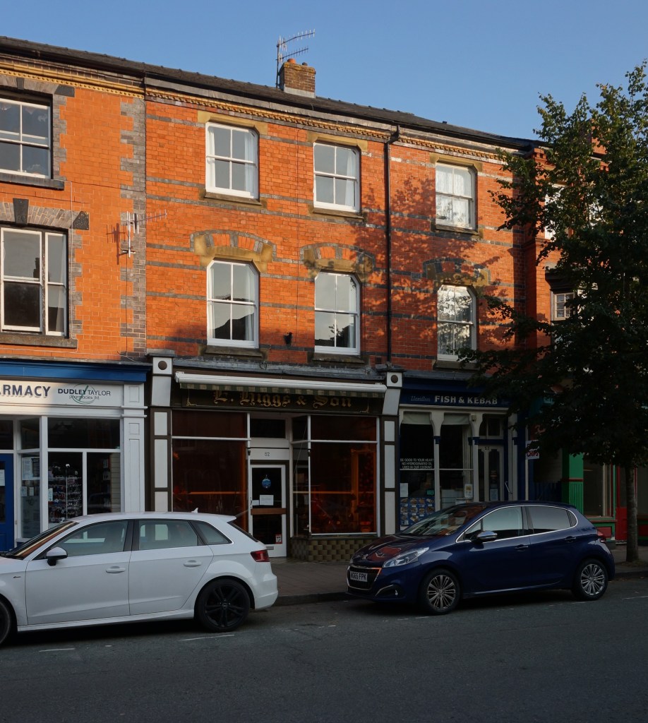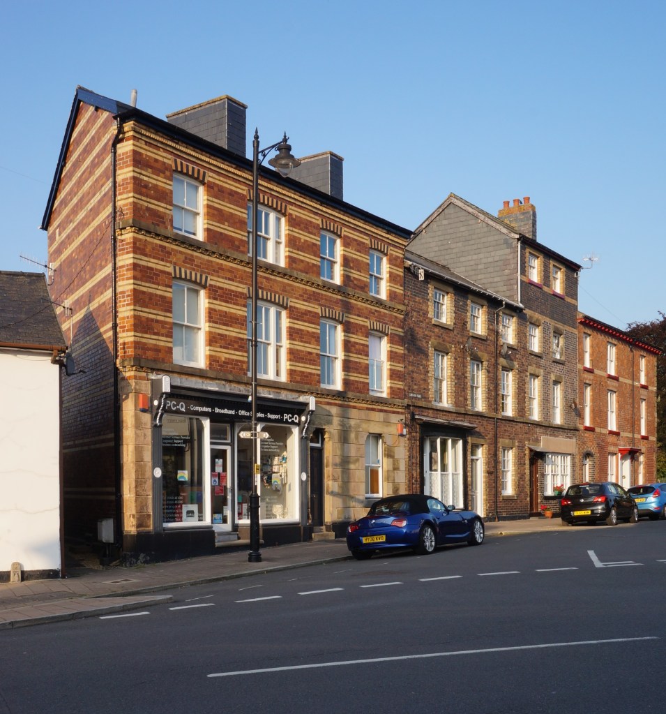 In 1864, the firm put up a magistrates’ court on High Street in Llanidloes, (formerly Montgomeryshire, now Powys). Here, the material is the red brick that predominates in the town enlivened with copious constructional polychromy, although most of the west elevation is slate-hung in accordance with a local tradition. The window and door jambs are intricately chamfered, sometimes in two orders. The pièce de résistance is the doorway leading to the courtroom at the rear of the building with a polygonal intrados to the arch and chunky wrought iron door furniture. Lloyd speculates that this commission was the work of Poundley alone, acting in his capacity of County Surveyor, but this wants confirmation.